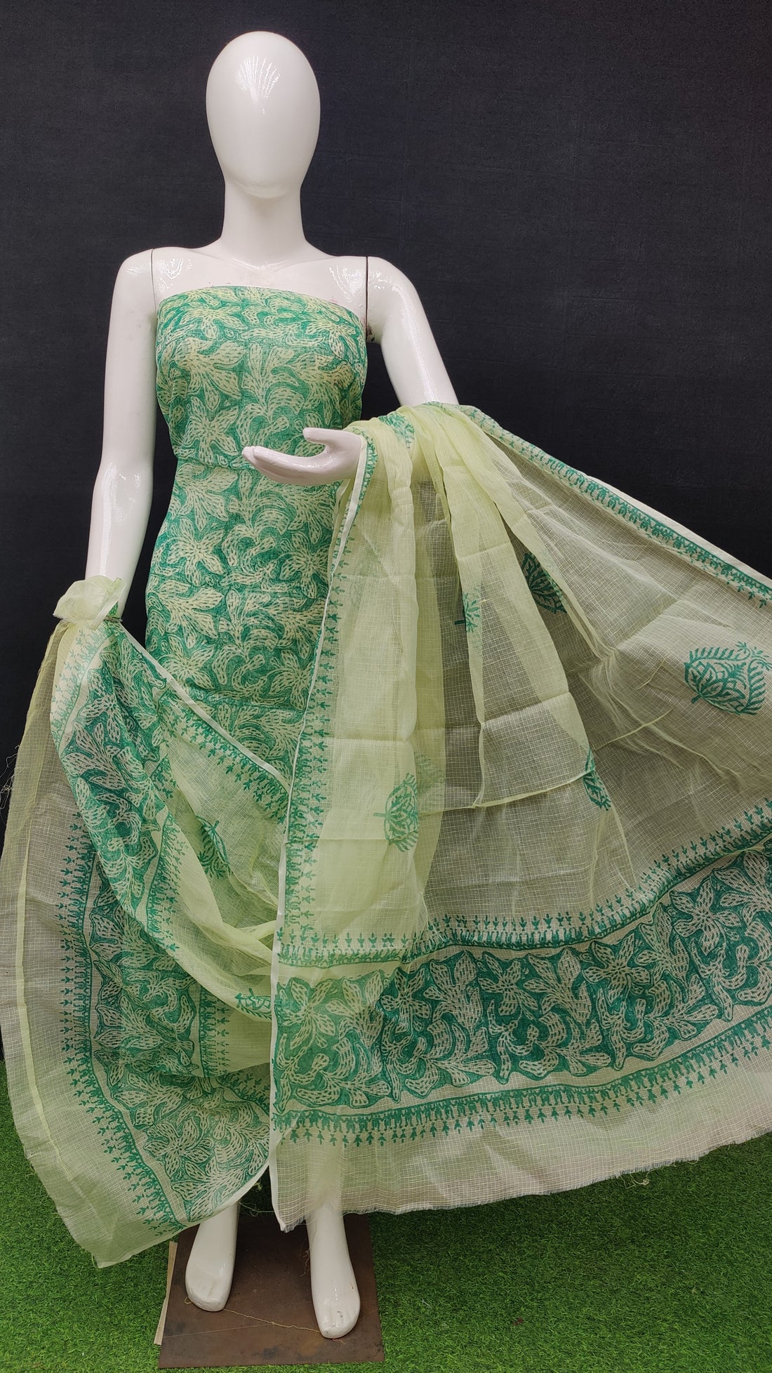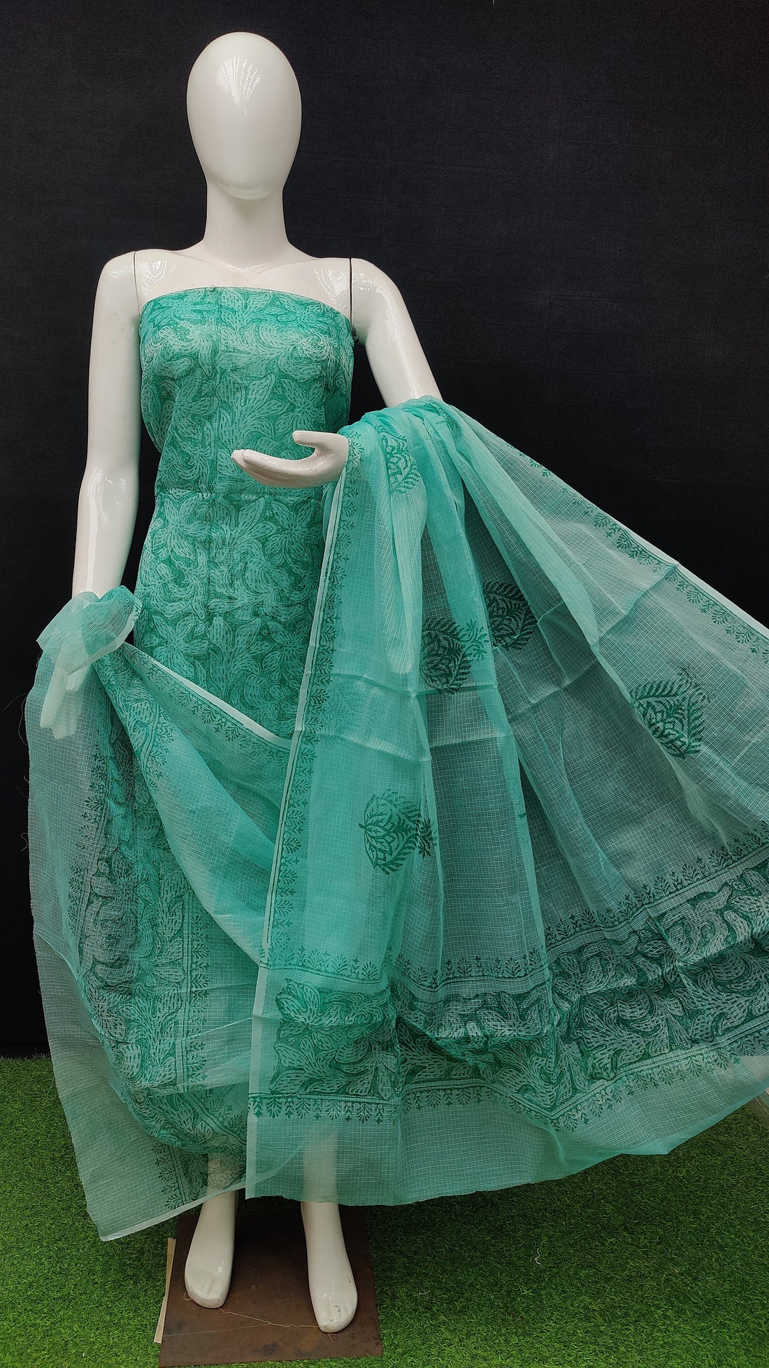 Sea Green Kota Doria Cotton Block Printed Dress Material