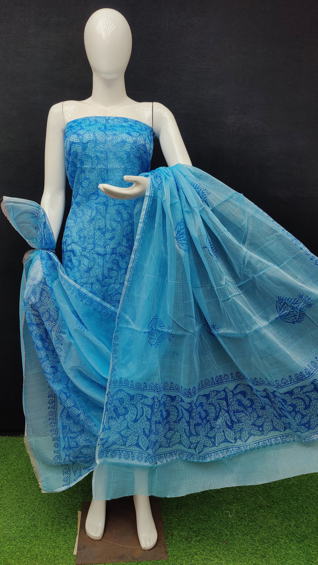 Sky-blue Kota Doria Cotton Block Printed Dress Material