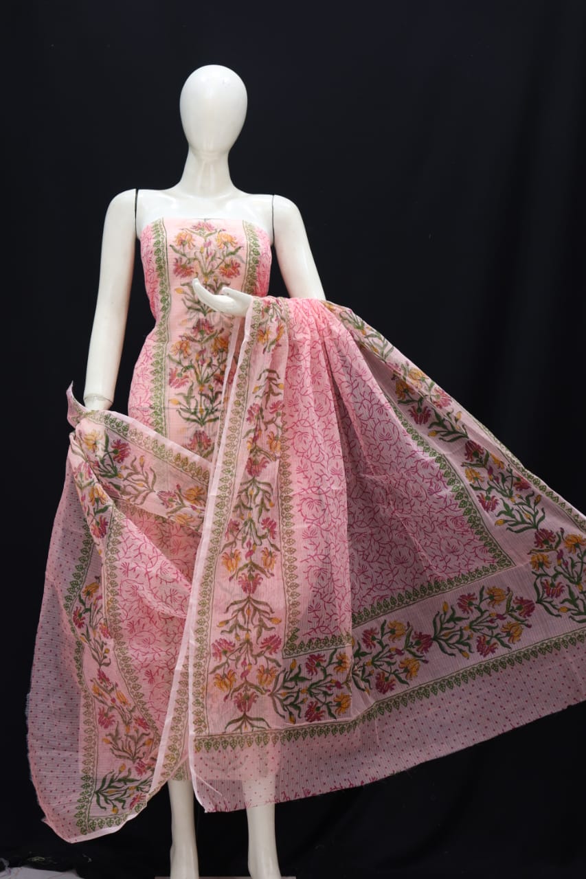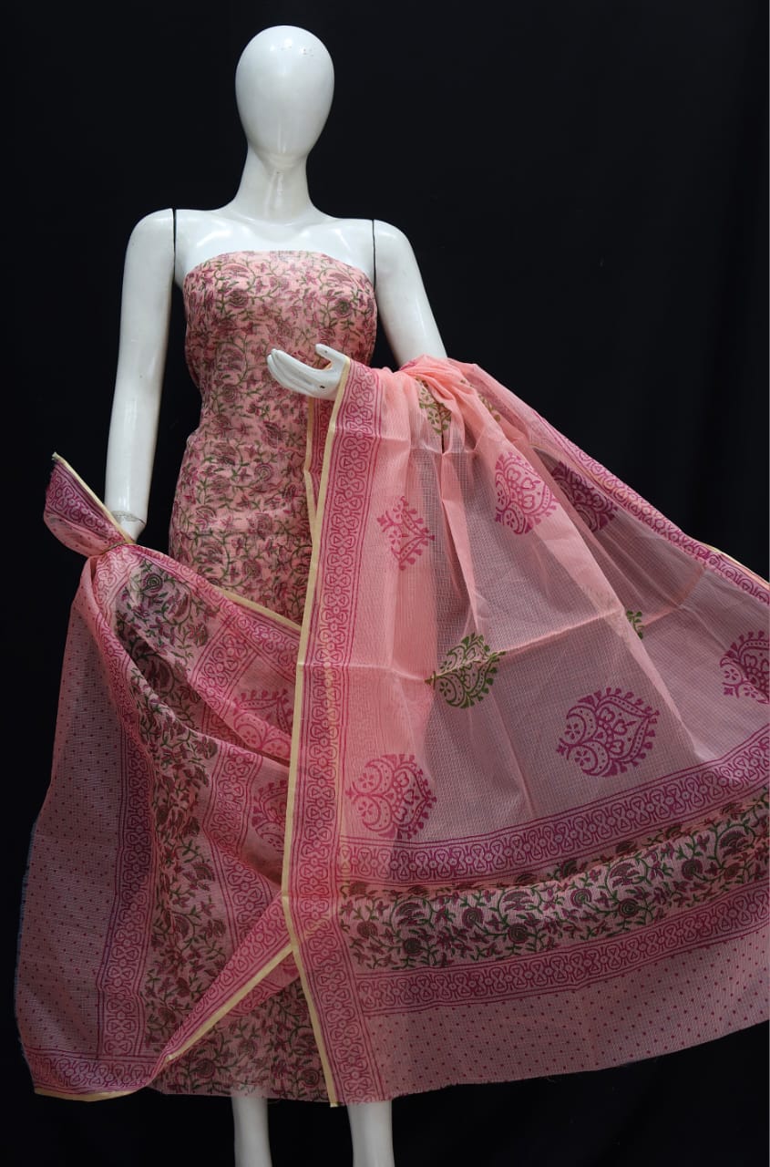 Pink lehriya Kota Doria Cotton Block Printed Dress Material