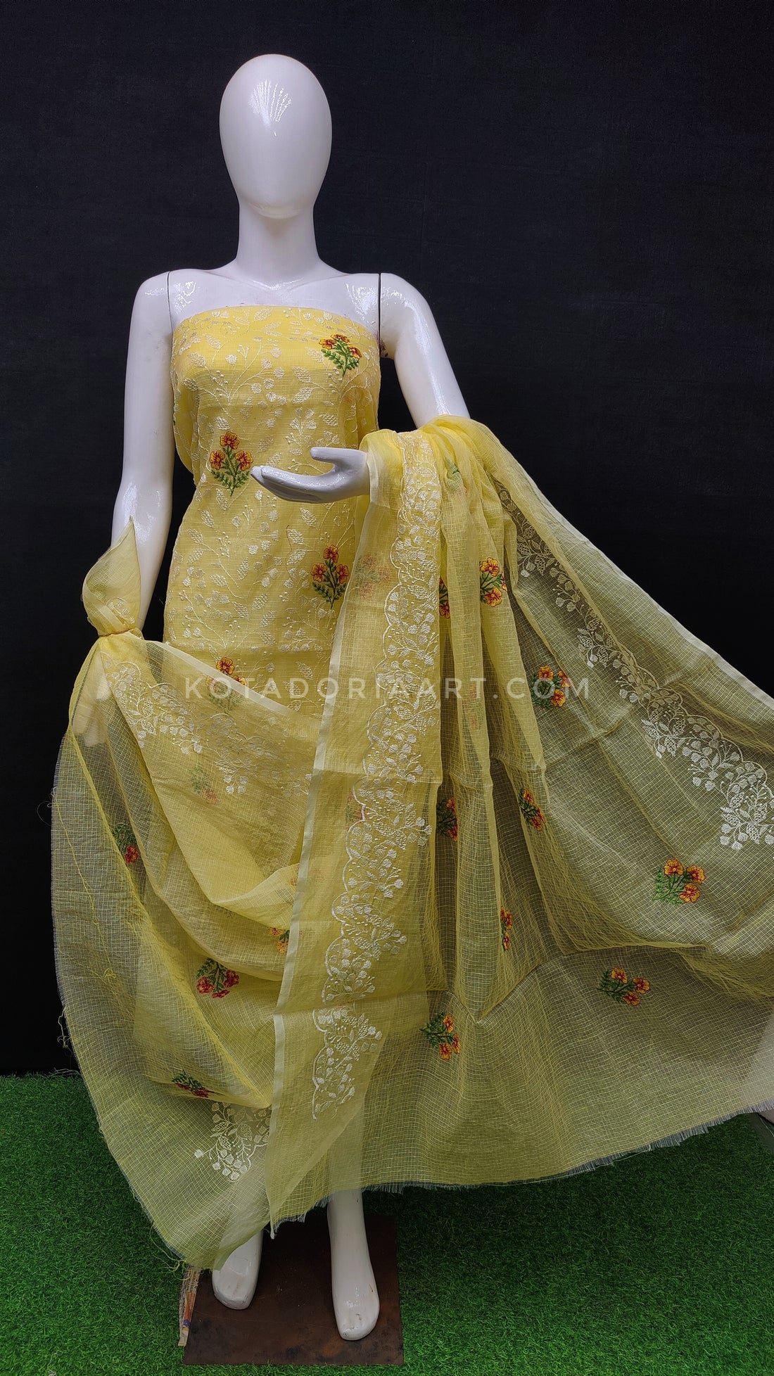 Yellow Kota Doria Cotton Embroidery Work Dress Material -
