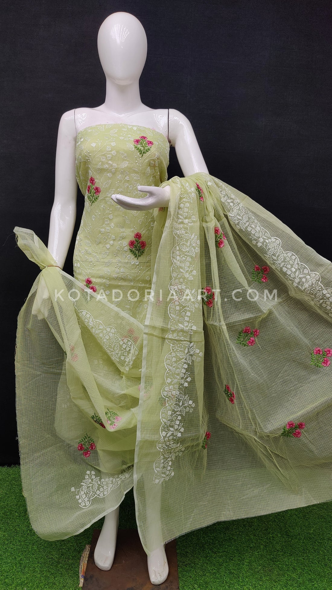 Green Kota Doria Cotton Embroidery Work Dress Material