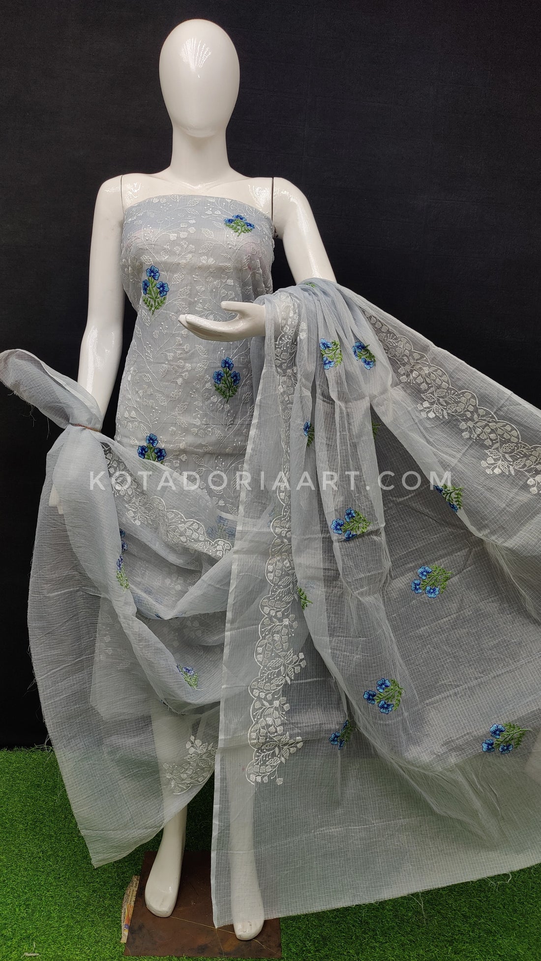 Sky-blue Kota Doria Cotton Embroidery Work Dress Material