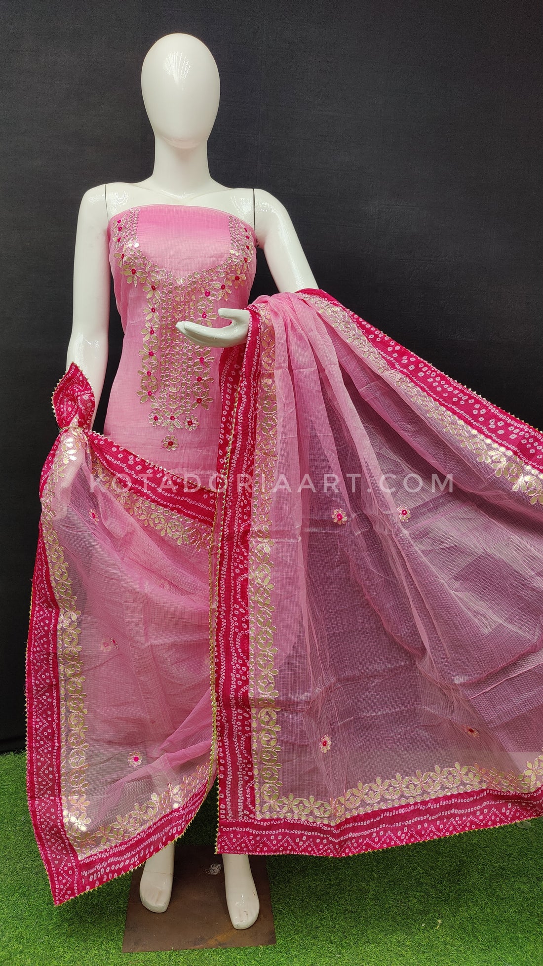 Pink Bandhej Border Kota Doria Cotton Gota-Patti Work Dress Material