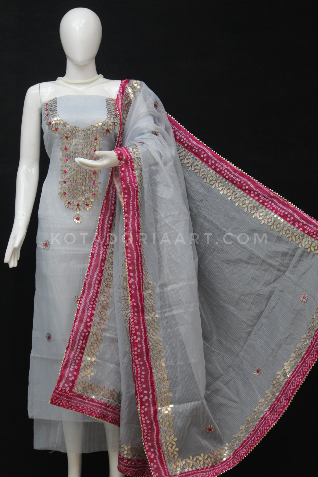 Gray Bandhej Border Kota Doria Cotton Gota-Patti Work Dress Material