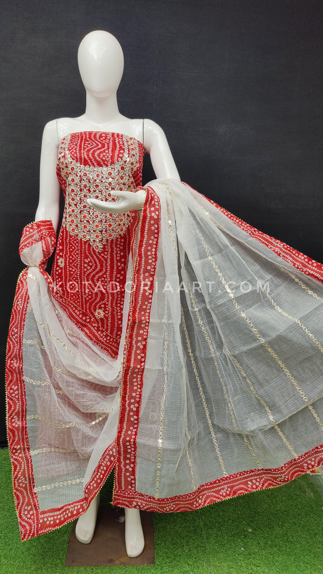 Red Bandhej Kota Doria Cotton Gota-Patti Work Dress Material