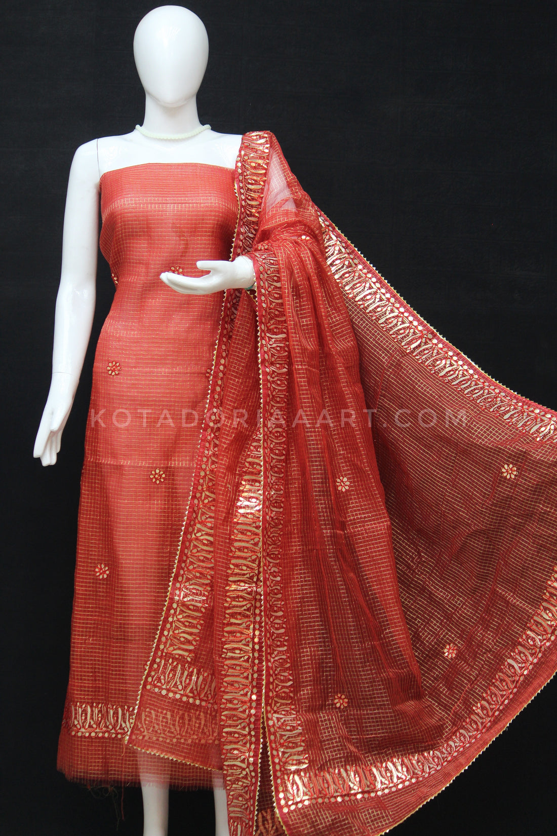 Red Kota Doria Cotton Gota-Patti Work Dress Material With Bottom.