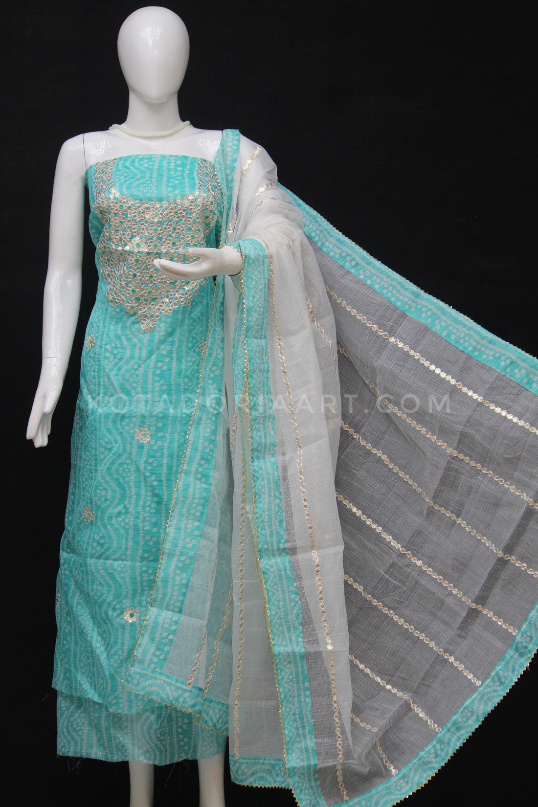 Sea-Green Bandhej Border Kota Doria Cotton Gota-Patti Work Dress Material