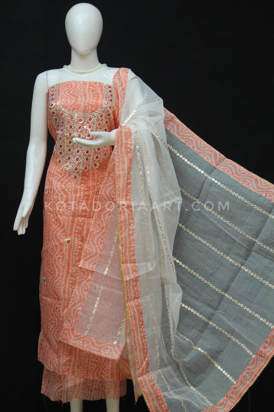 Peach Bandhej Kota Doria Cotton Gota-Patti Work Dress Material