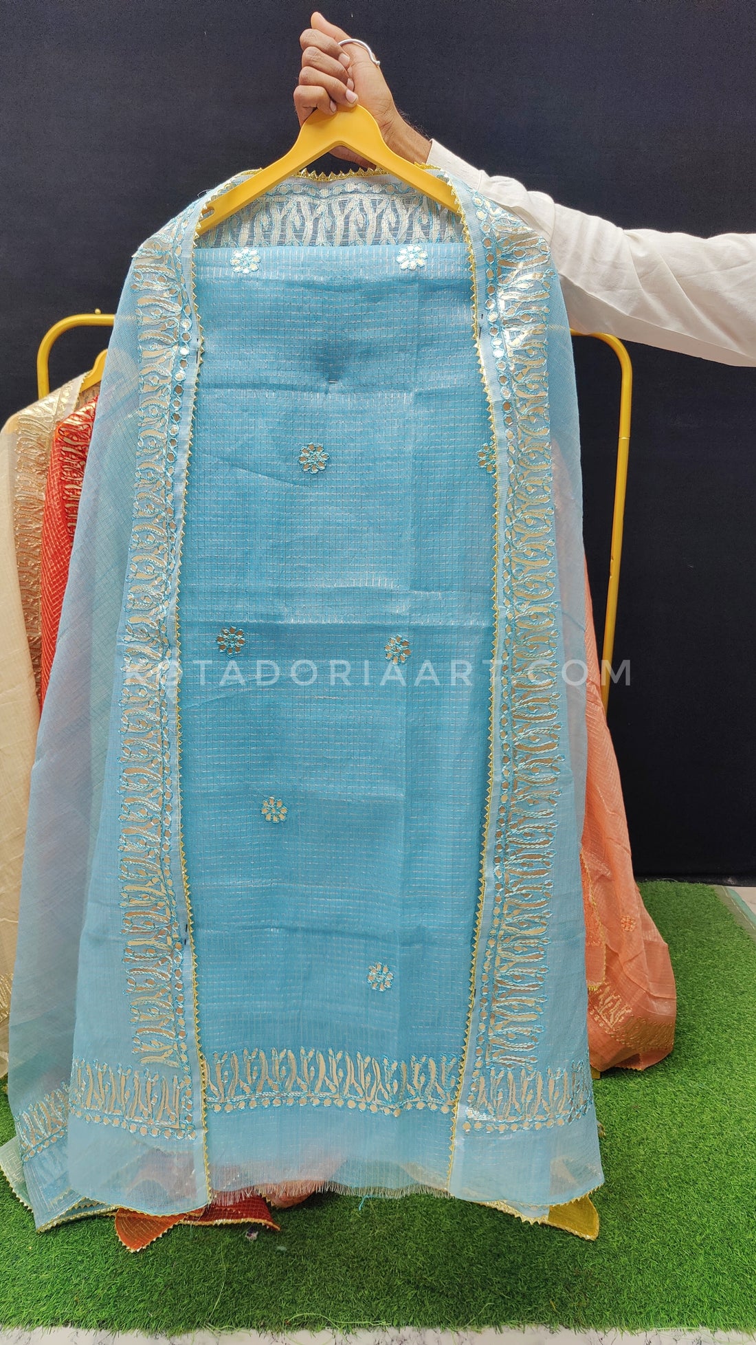 Sky-blue Kota Doria Cotton Gota-Patti Work Dress Material with Bottom