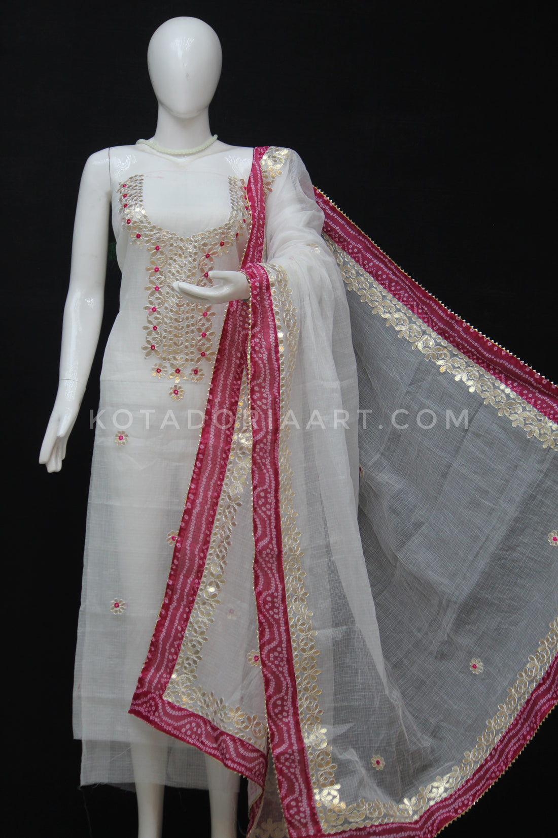White Bandhej Border Kota Doria Cotton Gota-Patti Work Dress Material