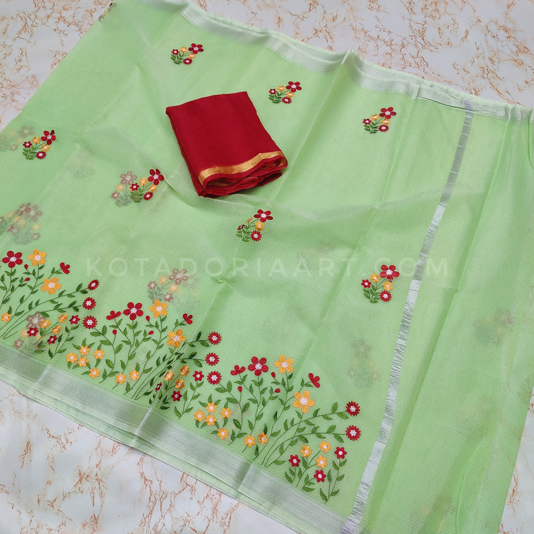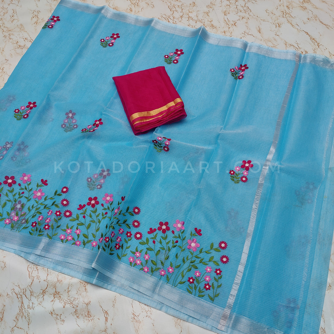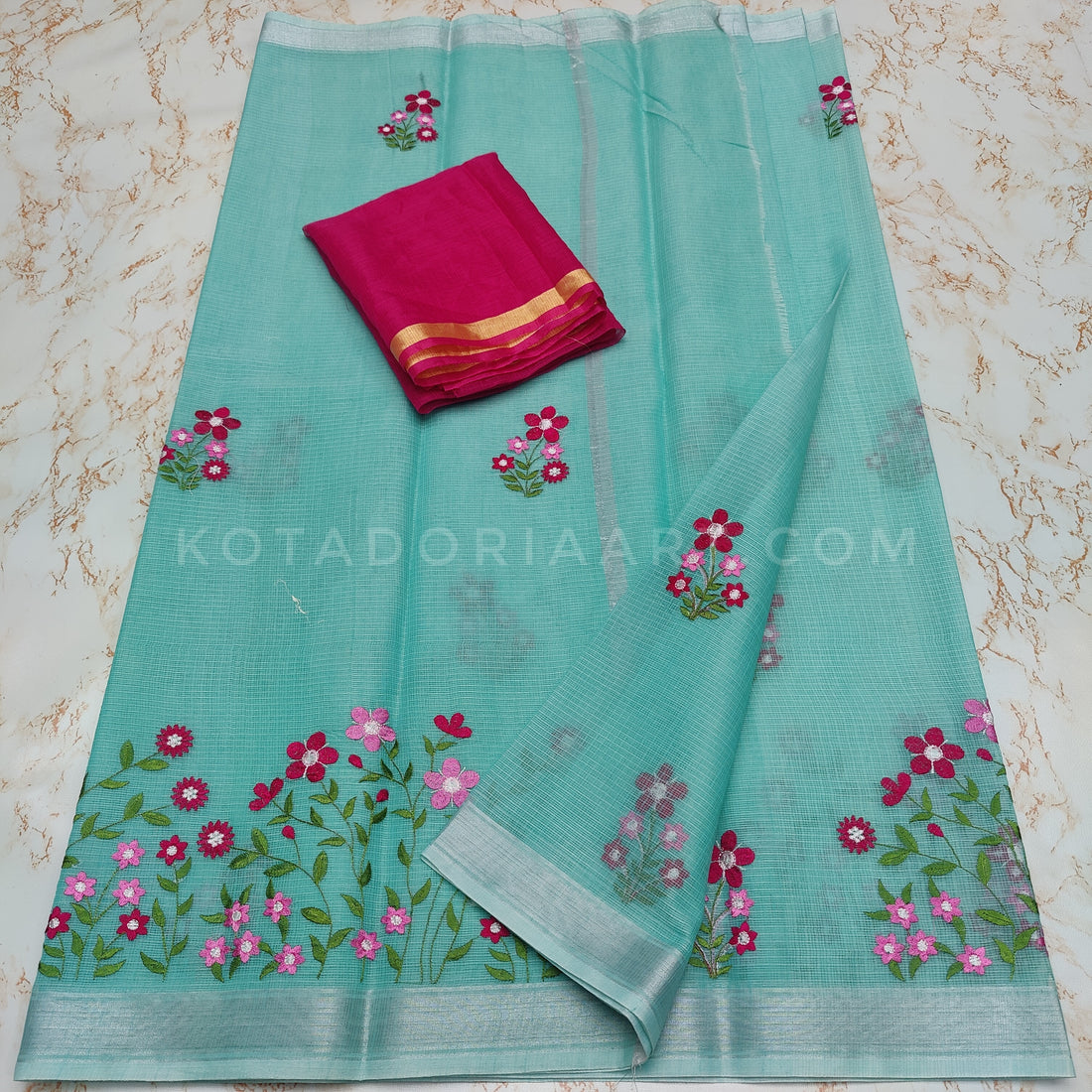 Cotton Kota Doria Embroidery Work Saree With Contrast Blouse Piece. Saree Length:- 5.5 Meters. Contrast...