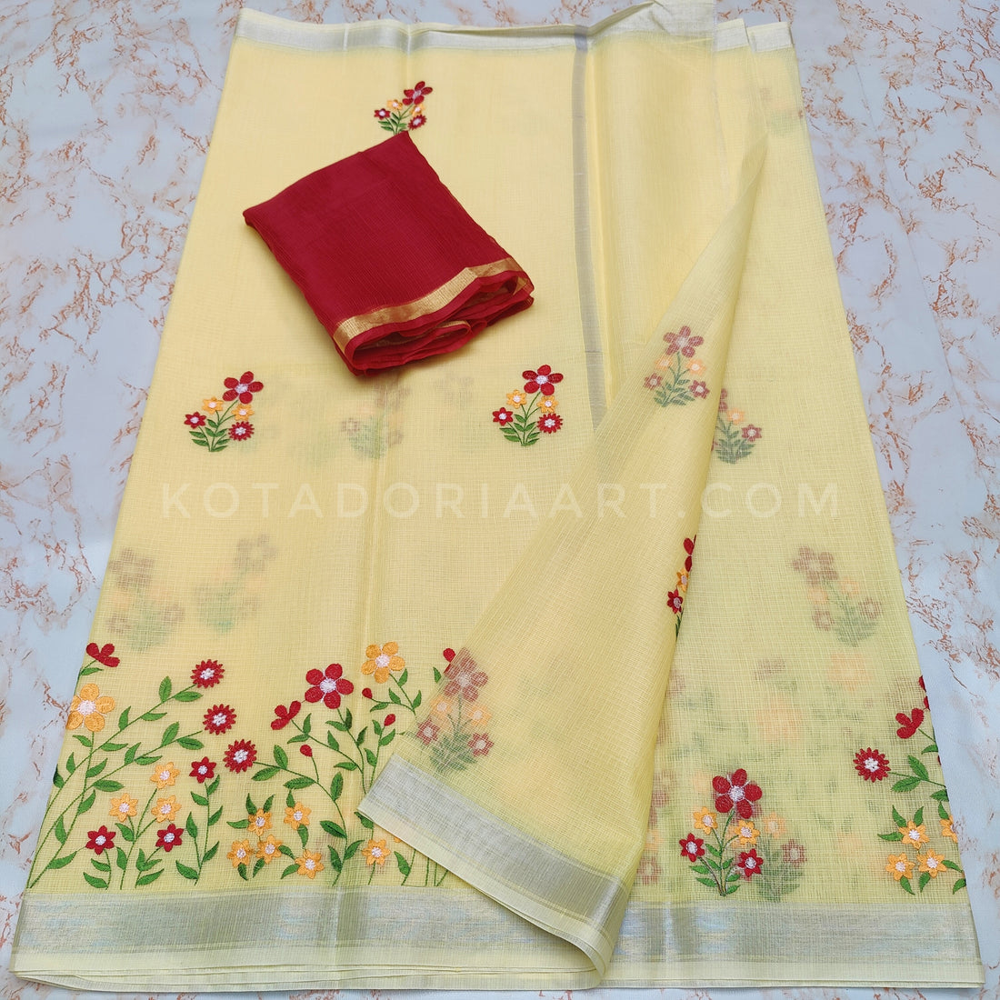 Yellow Cotton Kota Doria Embroidery Work Saree With Contrast Blouse Piece