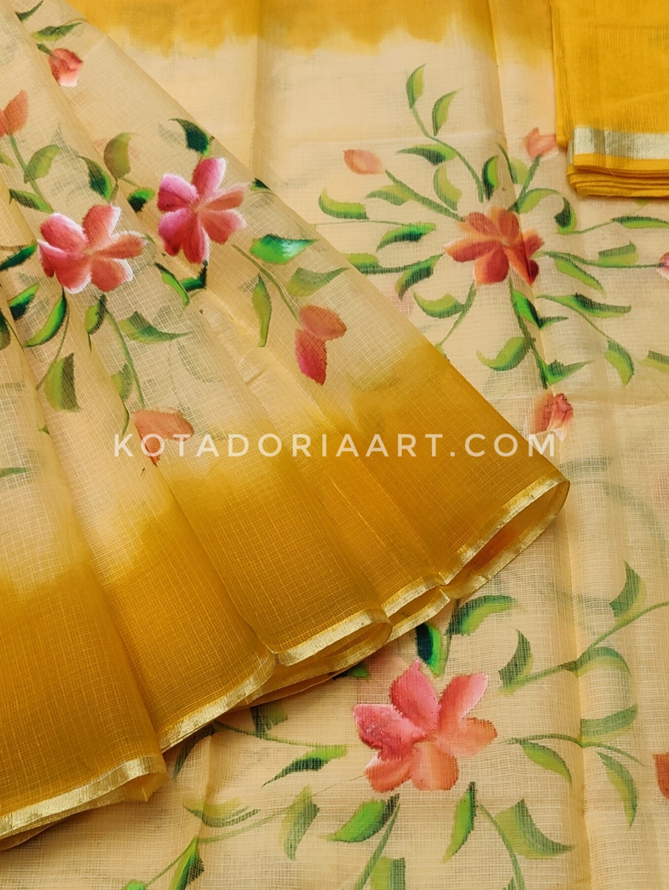 Badge Cotton Kota Doria Hand Painted Saree With Contrast Blouse