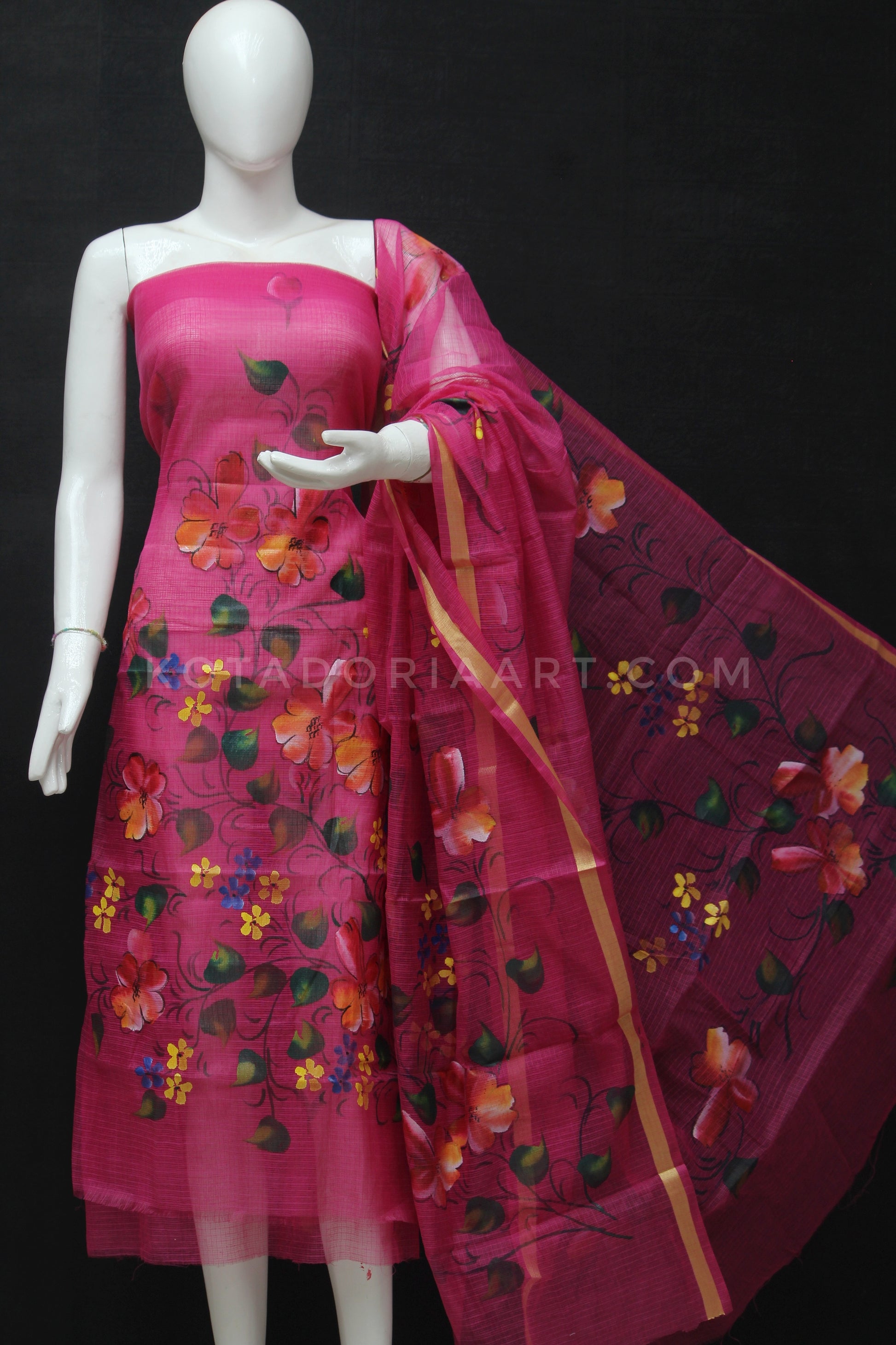 Raani Kota Doria Cotton Hand Pented Dress Material With Bottom.