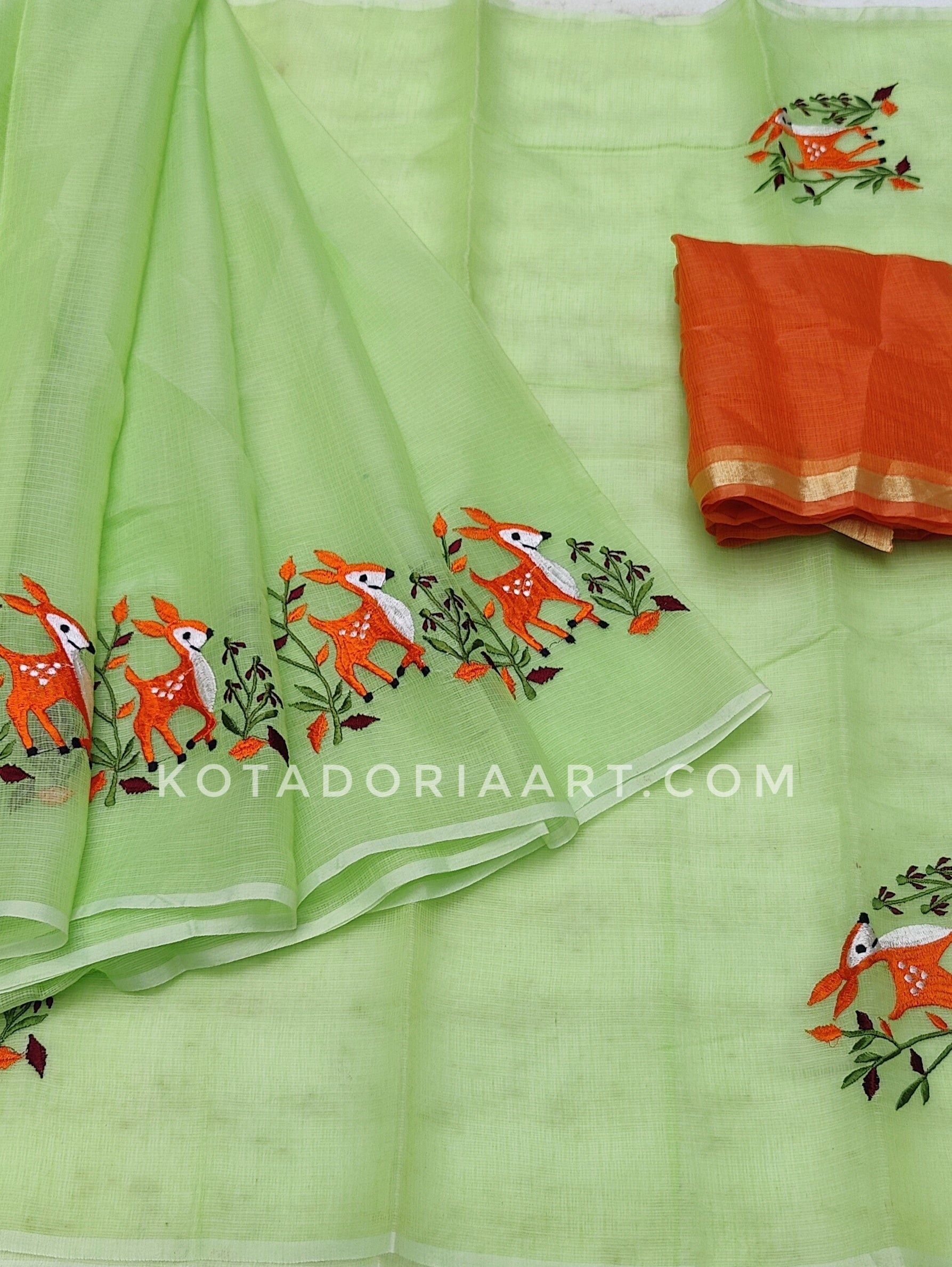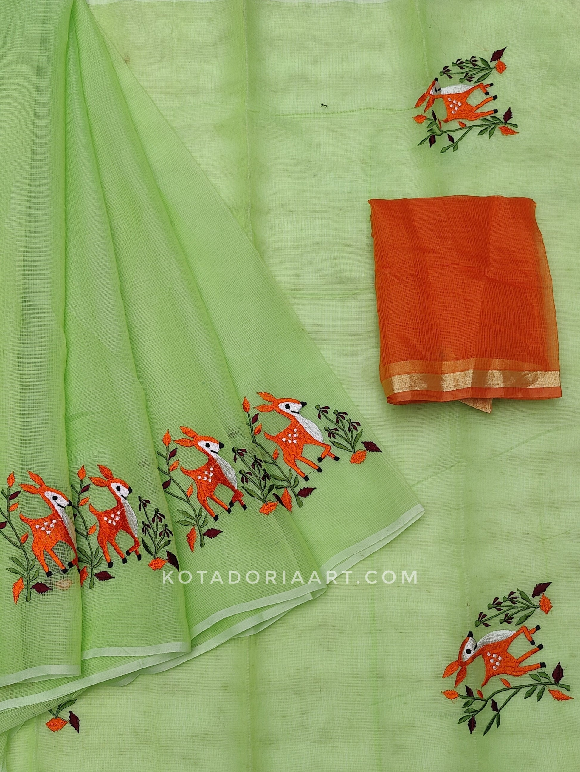 Green Cotton Kota Doria Embroidery Work Saree With Contrast Blouse Piece