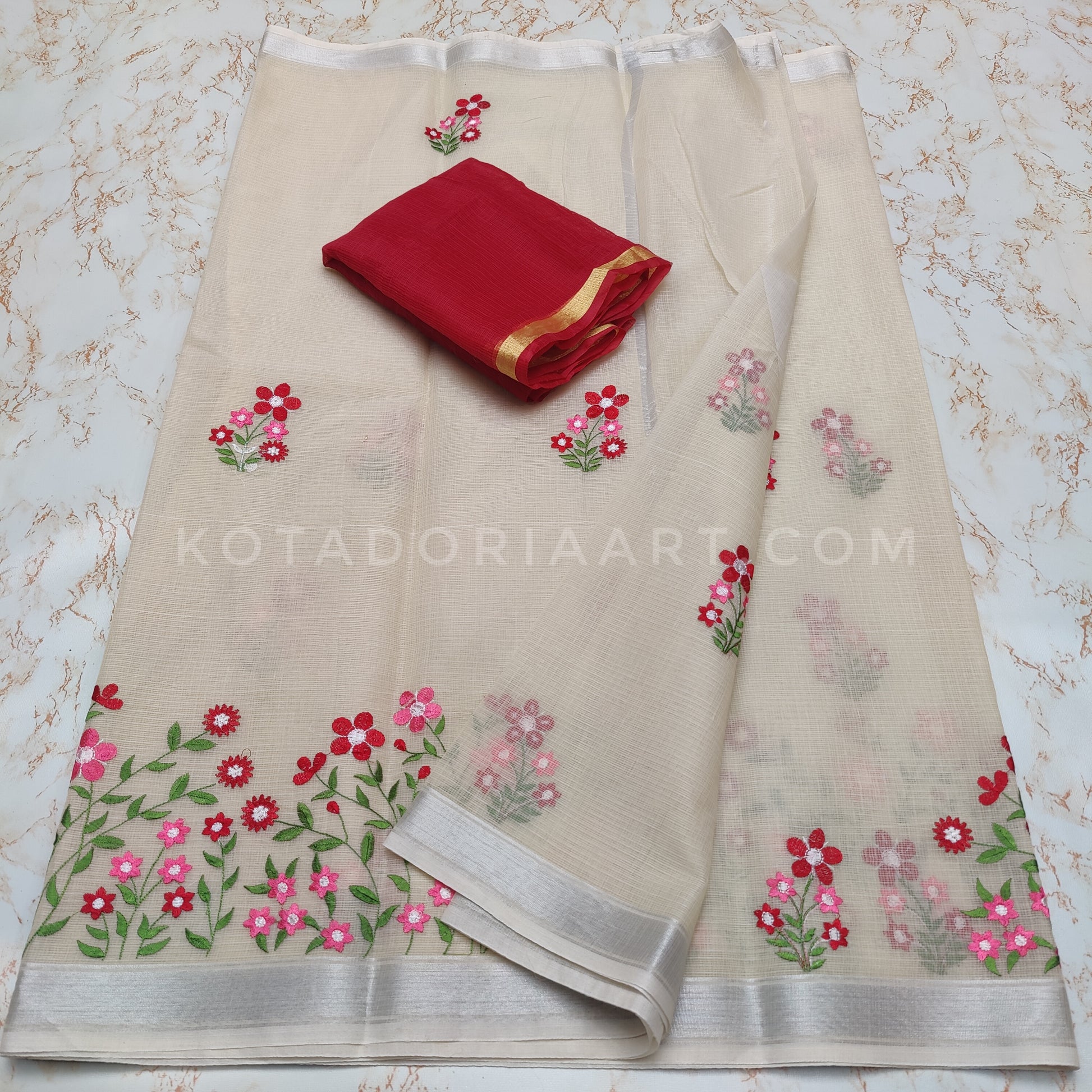 Beige Cotton Kota Doria Embroidery Work Saree With Contrast Blouse Piece