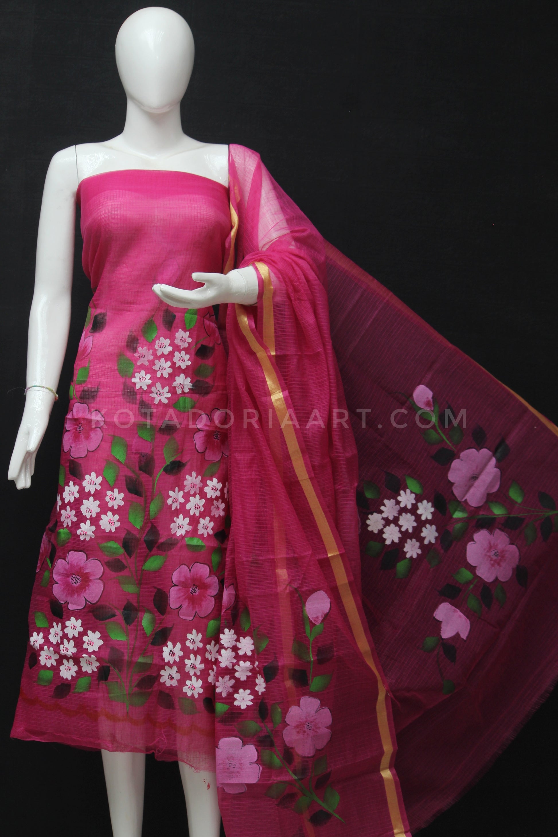Rani Kota Doria Cotton Hand Pented Dress Material With Bottom.