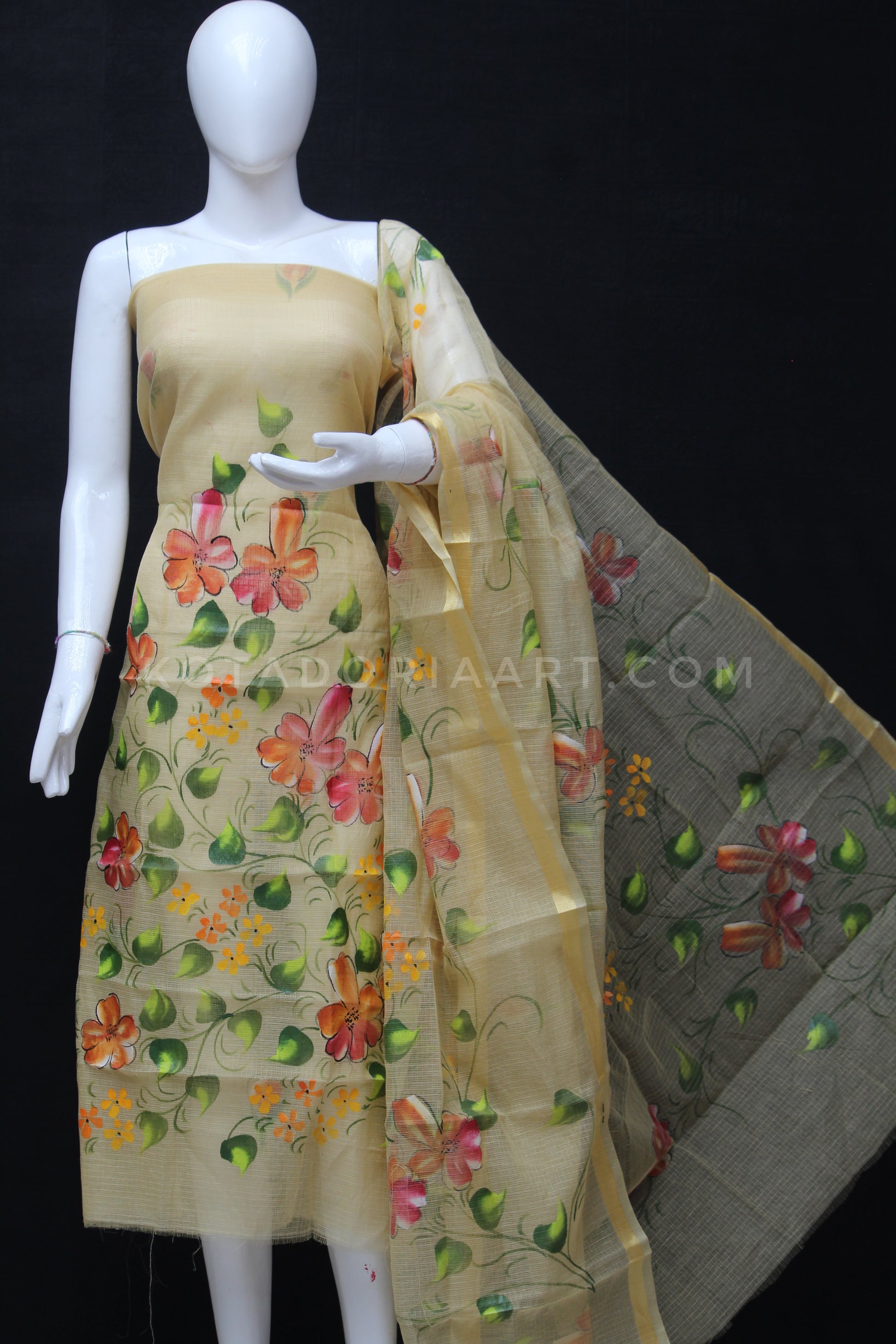 A5 - Beige Kota Doria Cotton Hand Pented Dress Material With Bottom.