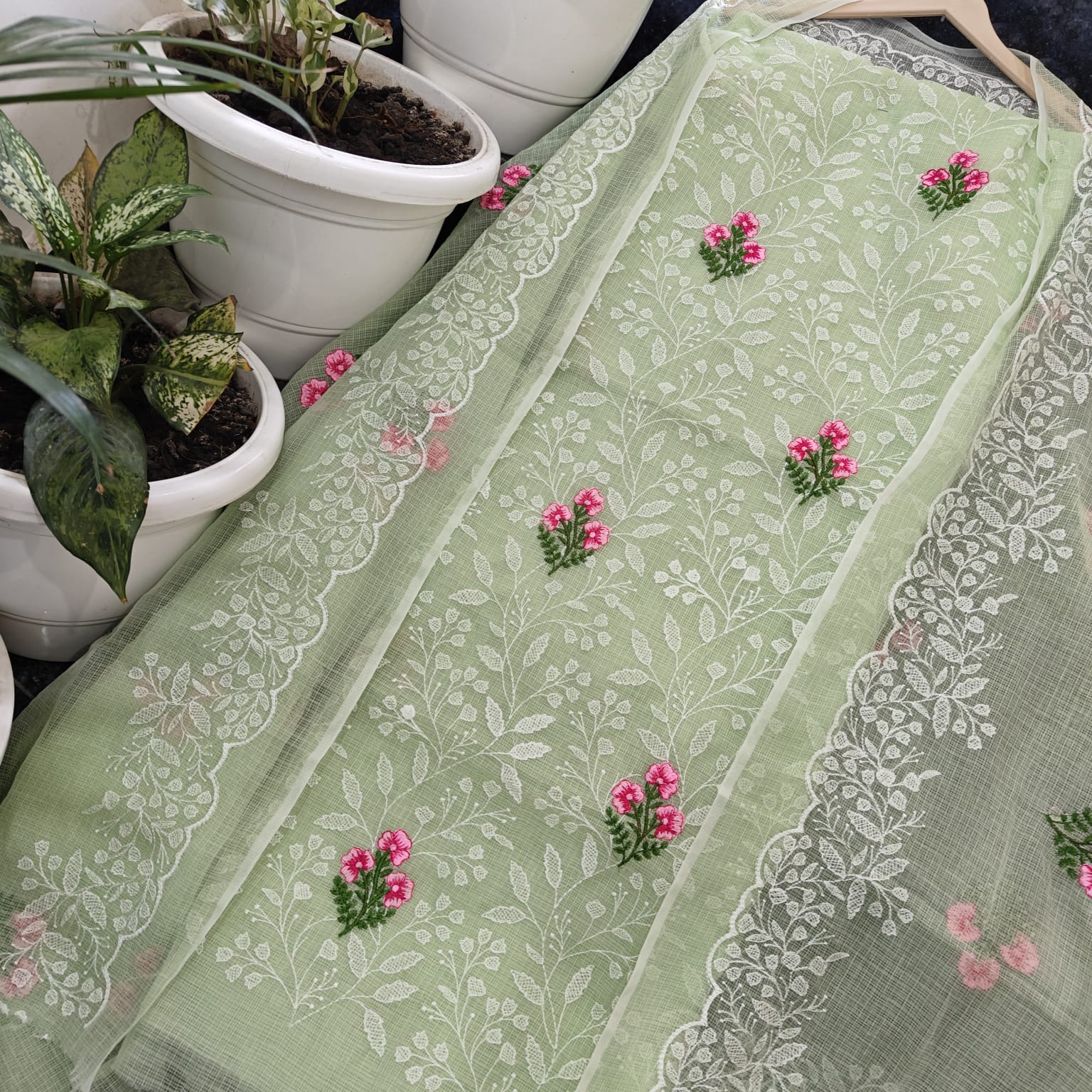 Mint-Green Kota Doria Cotton Embroidery Work Dress Material