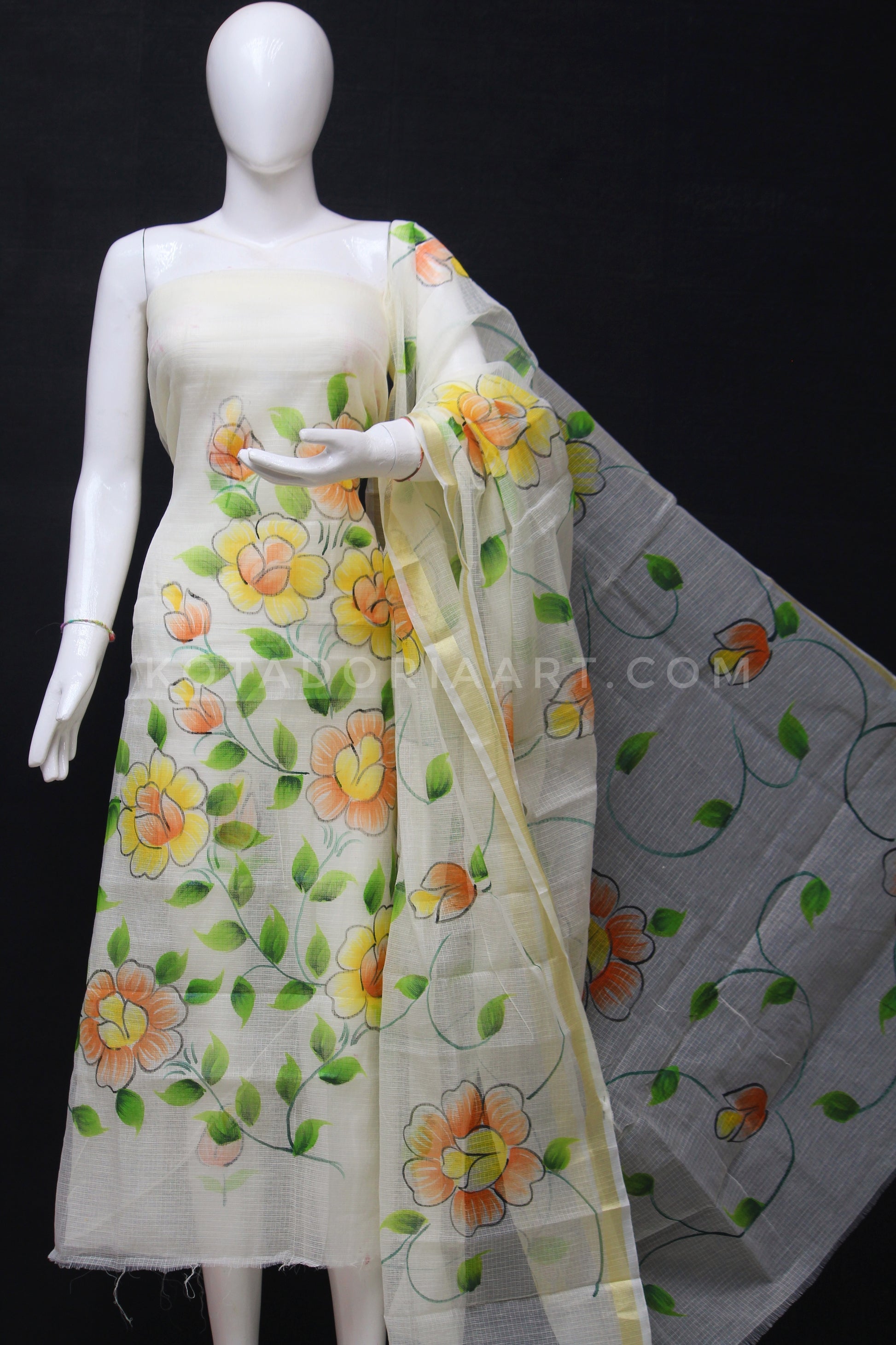 Cream Kota Doria Cotton Hand Pented Dress Material With Bottom.
