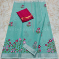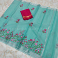 Sea-green Cotton Kota Doria Embroidery Work Saree With Contrast Blouse Piece