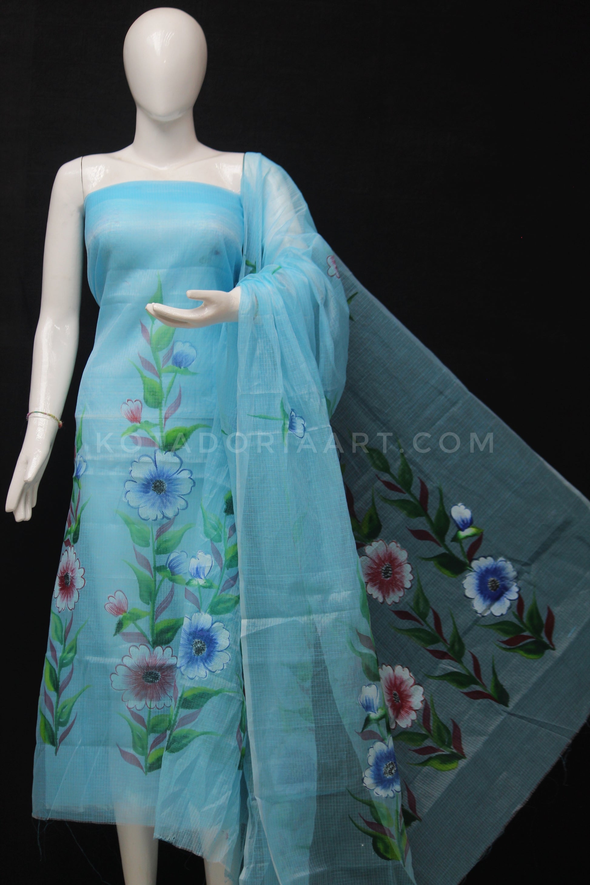 Sky-Blue Kota Doria Cotton Hand Pented Dress Material With Bottom.