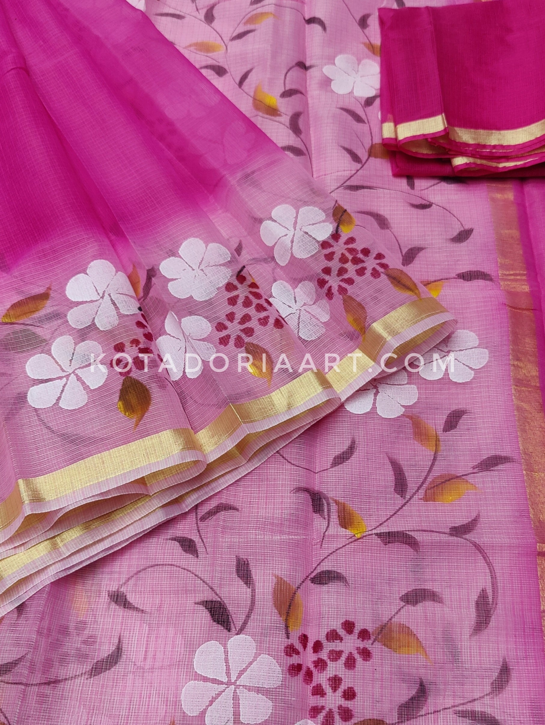 Raani Cotton Kota Doria Hand Painted Saree With Contrast Blouse