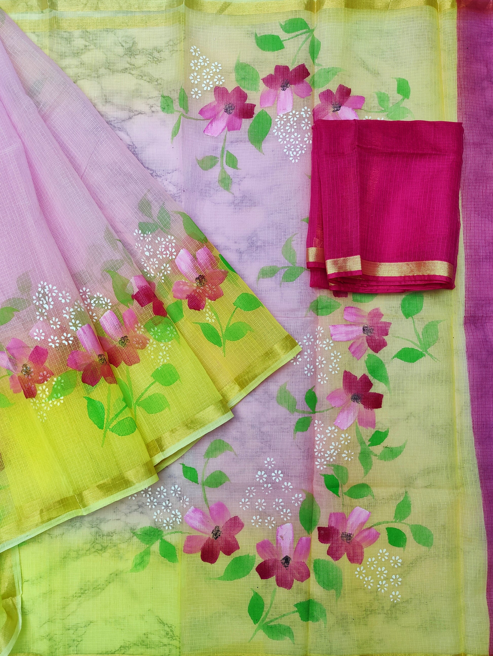 Cotton Kota Doria Hand Pented Saree With Running Blouse.