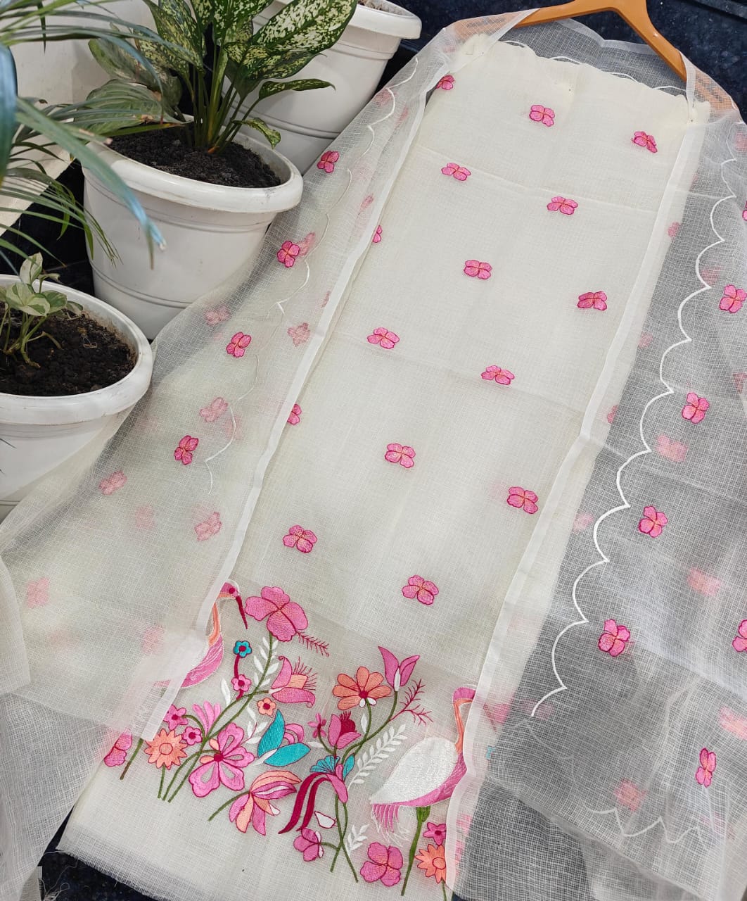 White Doria Cotton Embroidery Work Dress Material