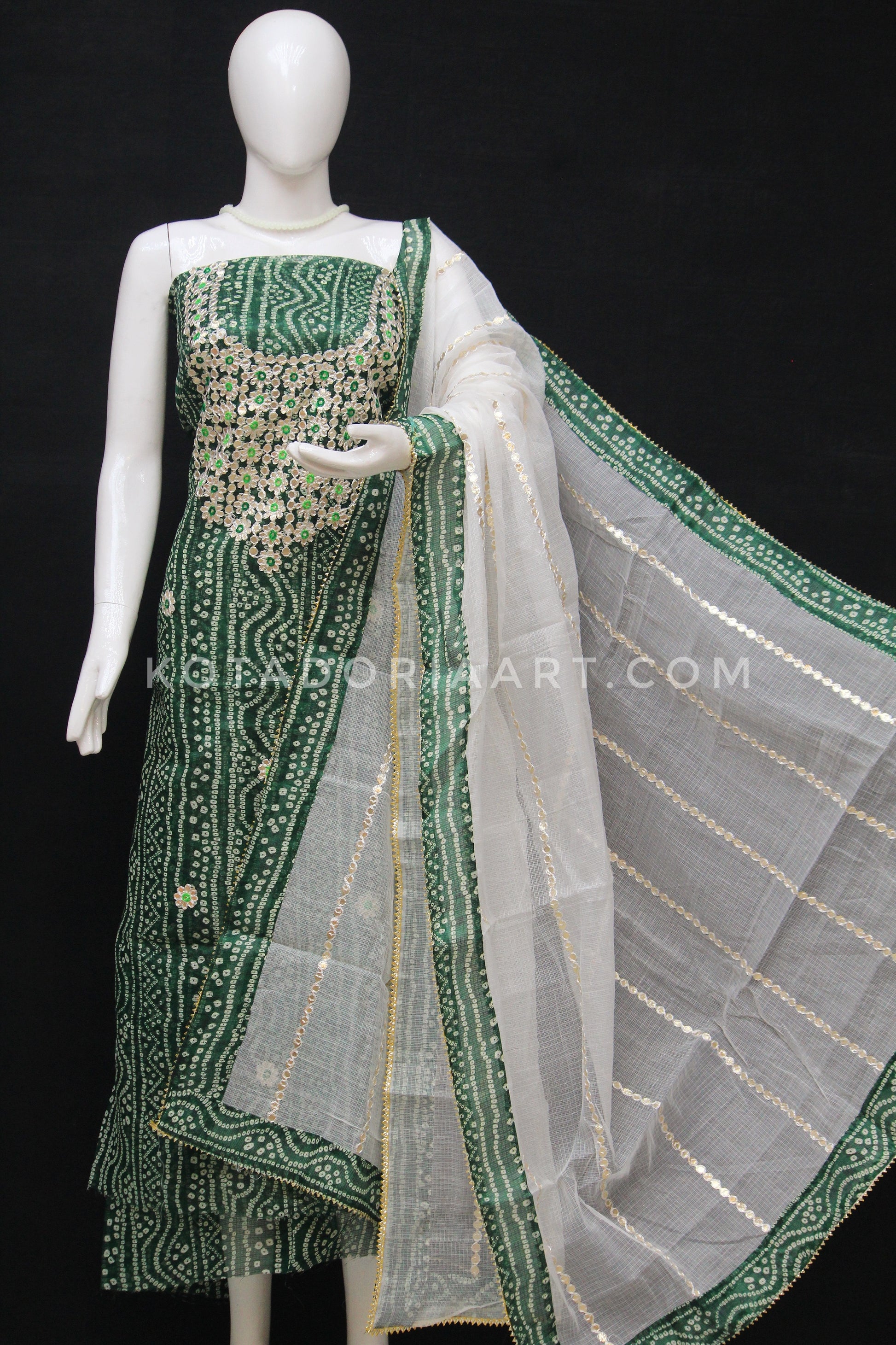 Green Bandhej Kota Doria Cotton Gota-Patti Work Dress Material