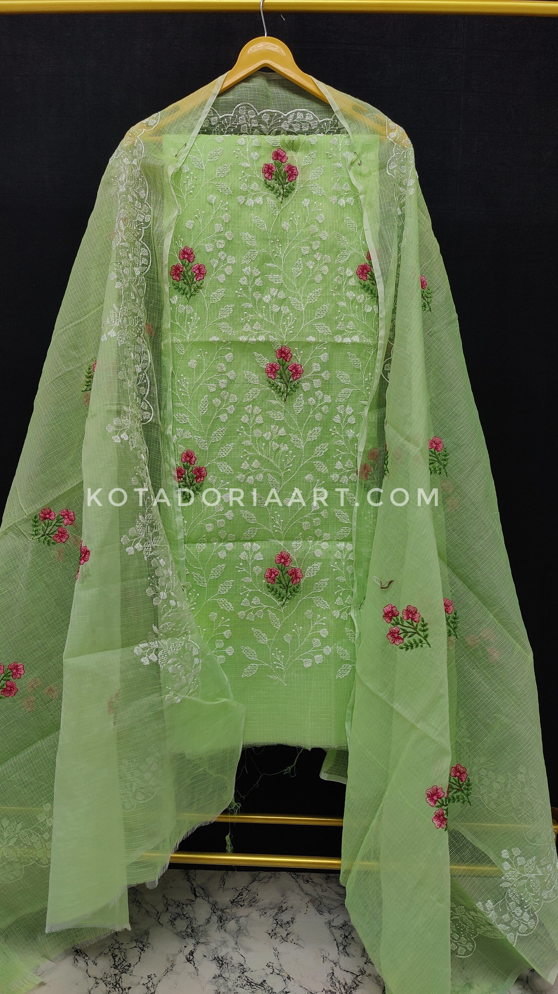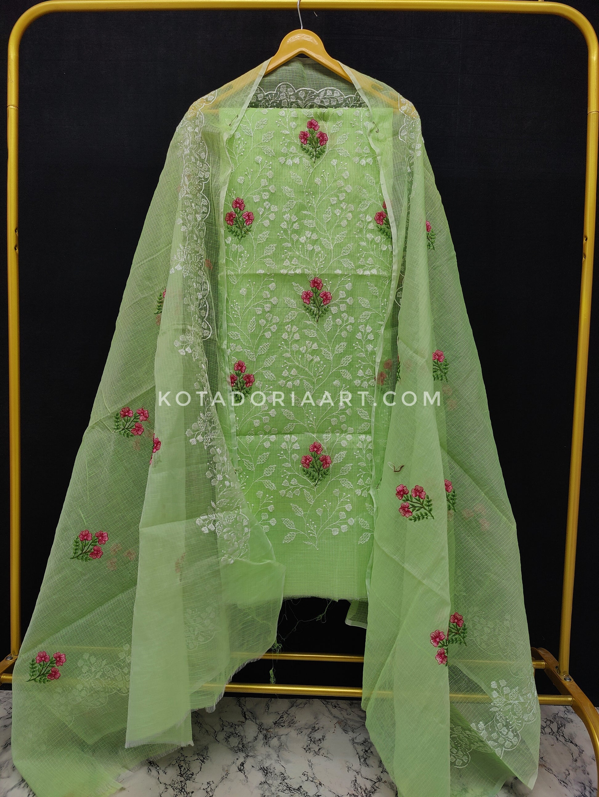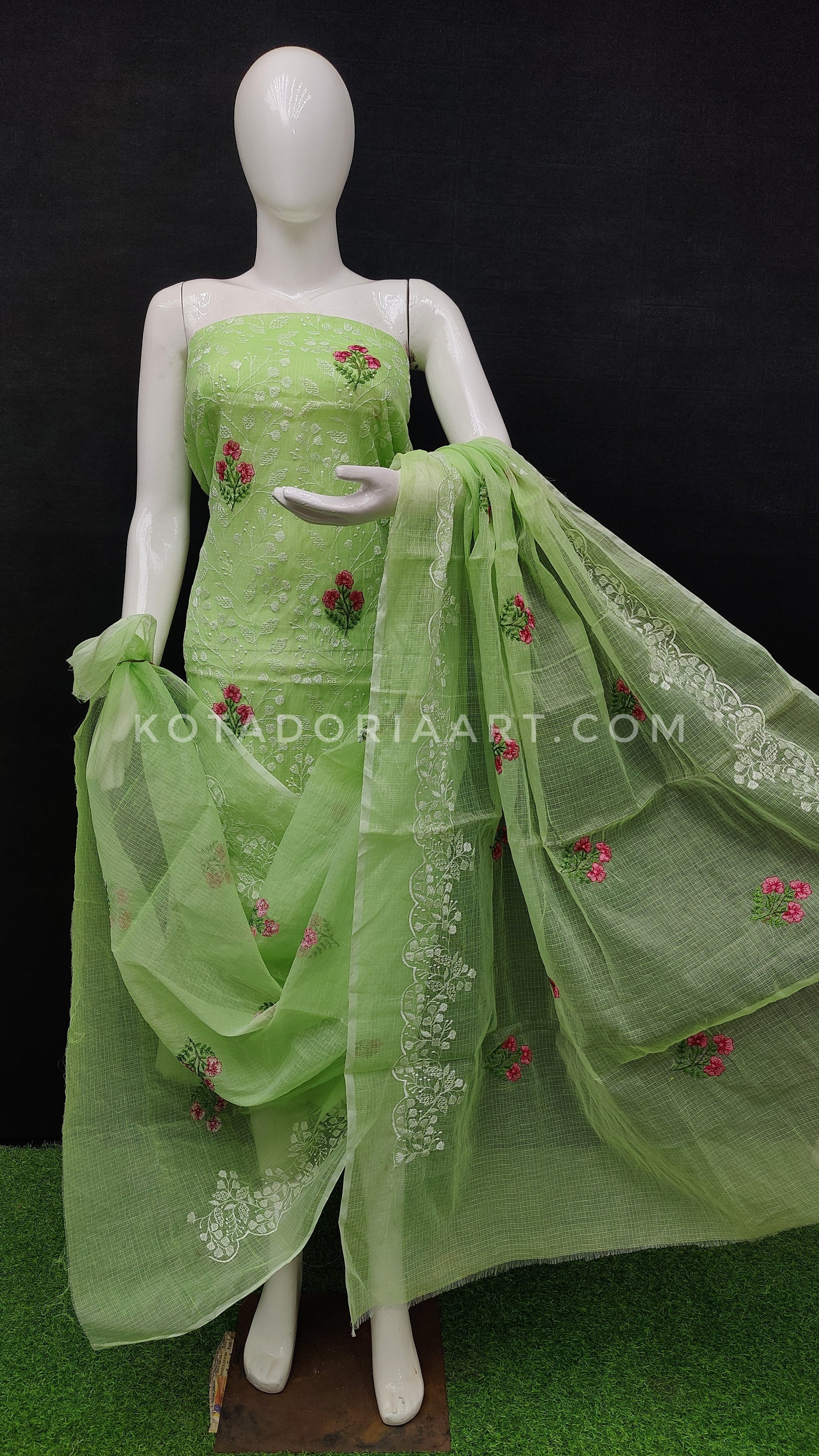 Green Kota Doria Cotton Embroidery Work Dress Material -