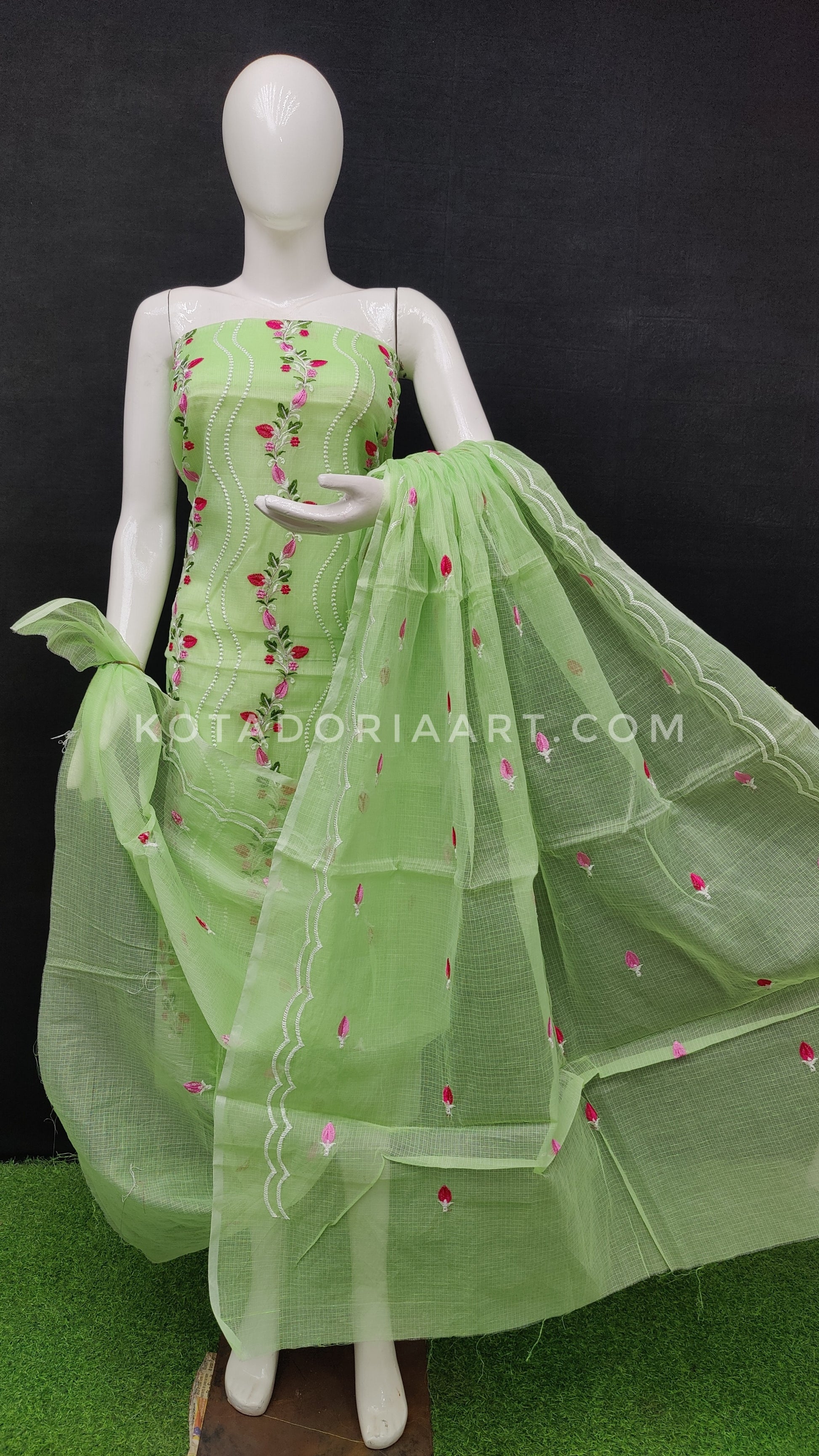 Green Kota Doria Cotton Embroidery Work Dress Material