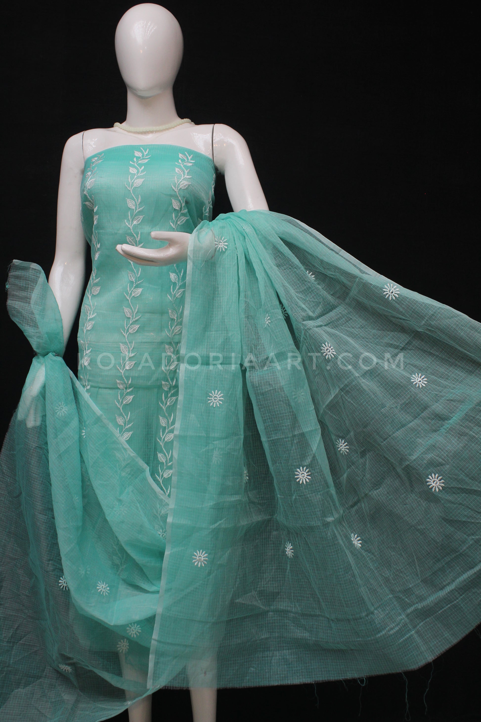 Sea-Green Kota Doria Cotton Embroidery Work Dress Material