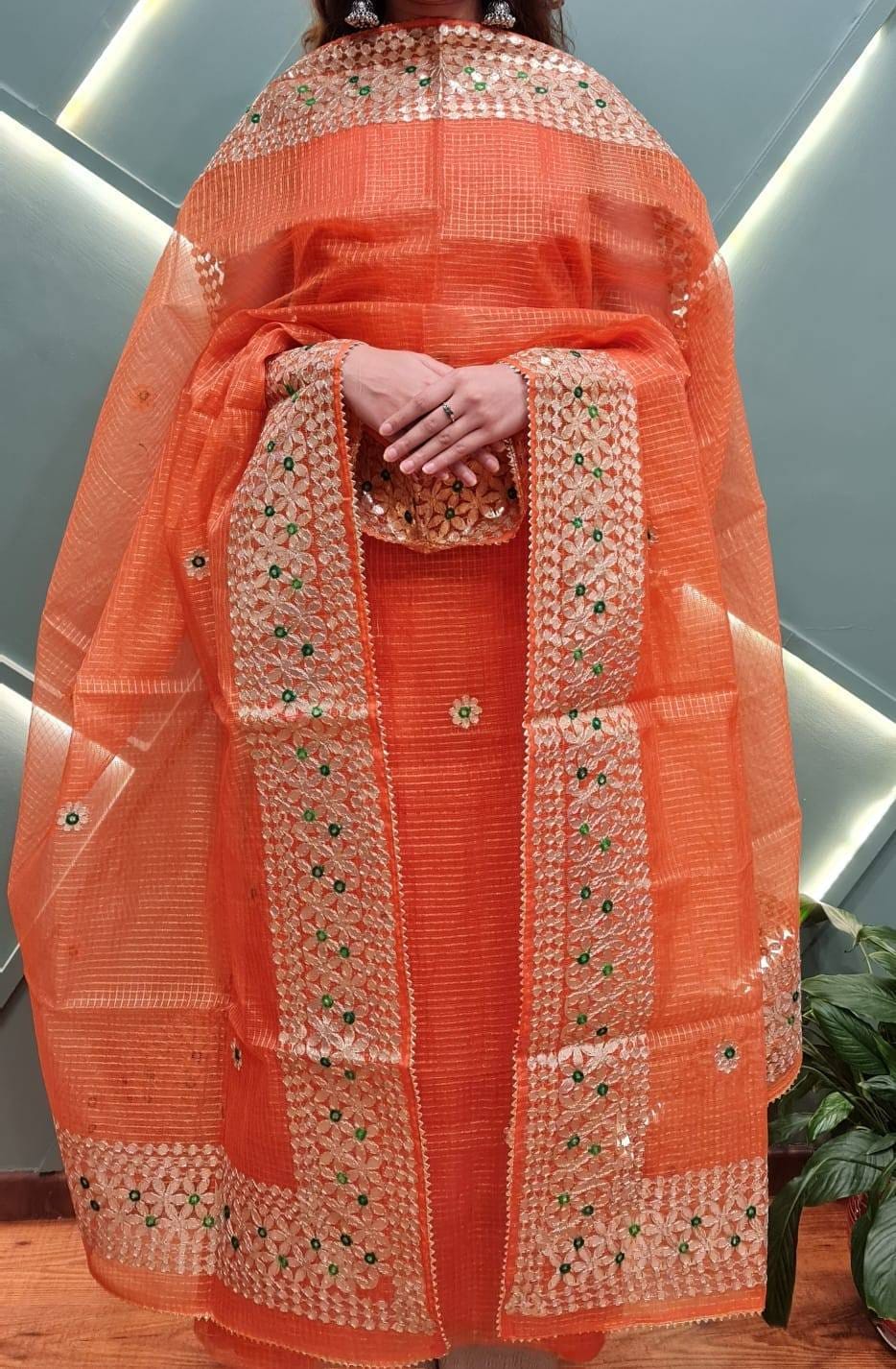 Dark Orange Kota Doria Cotton Gota-Patti Work Dress Material With Bottom.