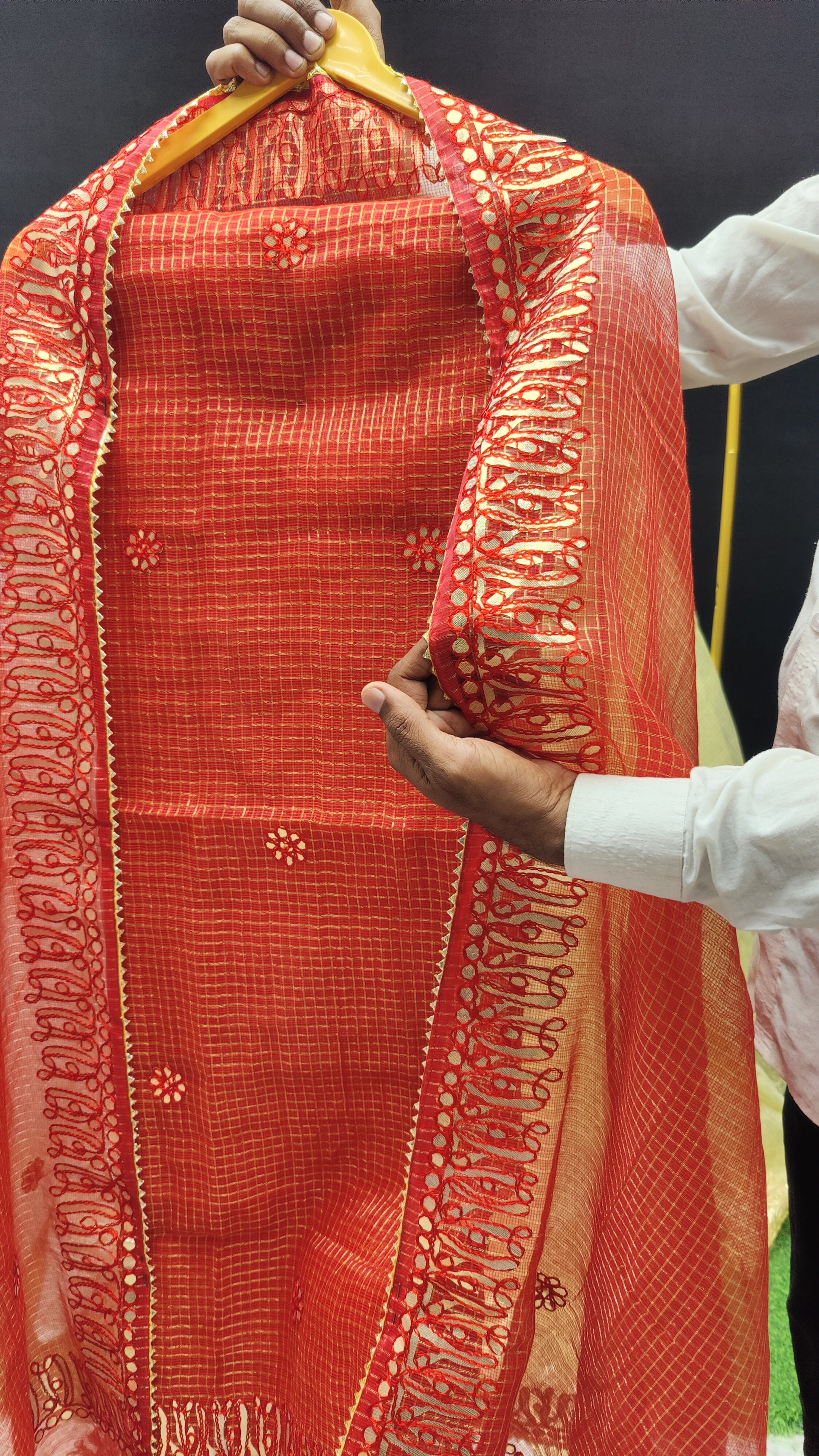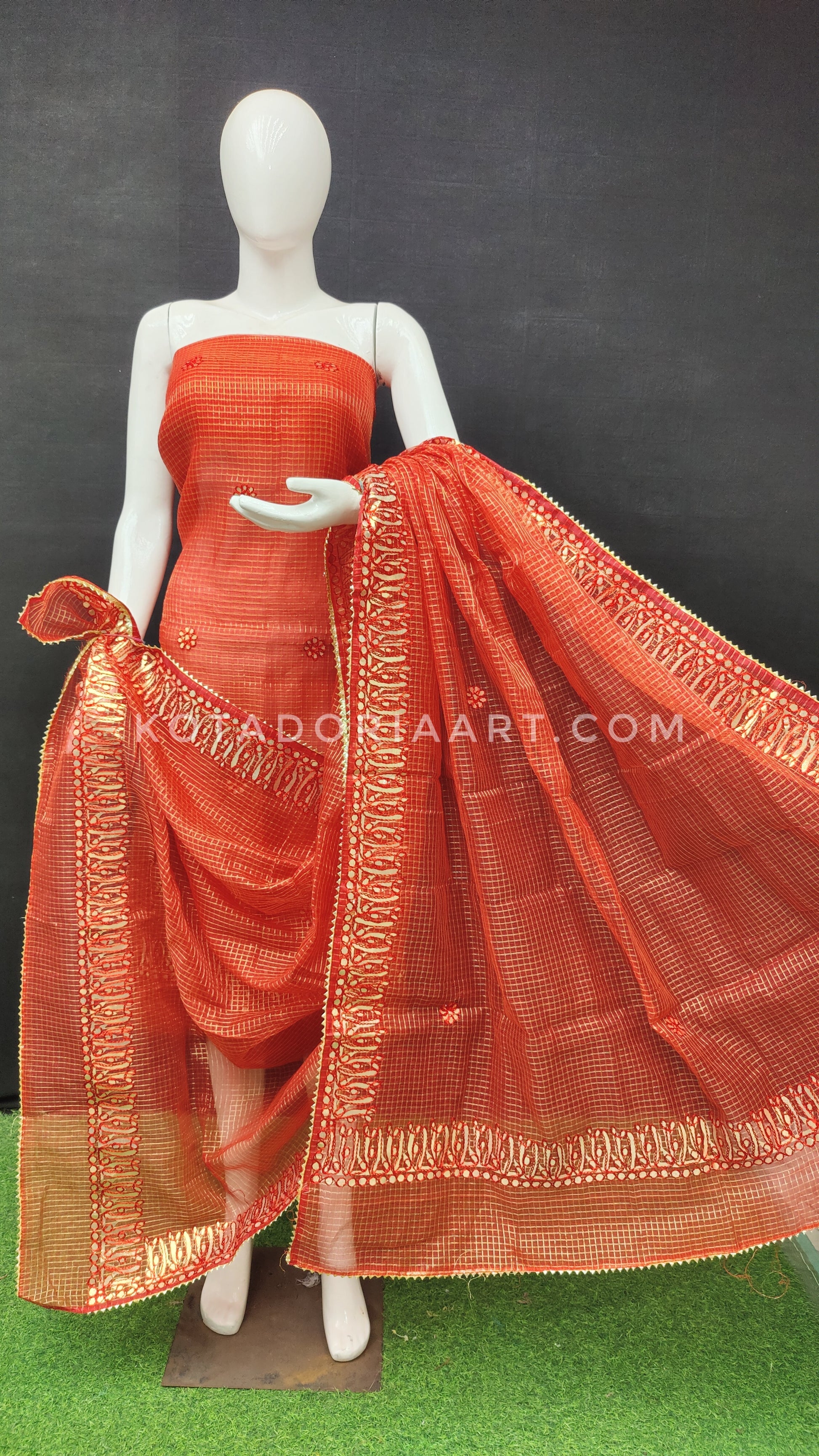 Red Kota Doria Cotton Gota-Patti Work Dress Material with Bottom