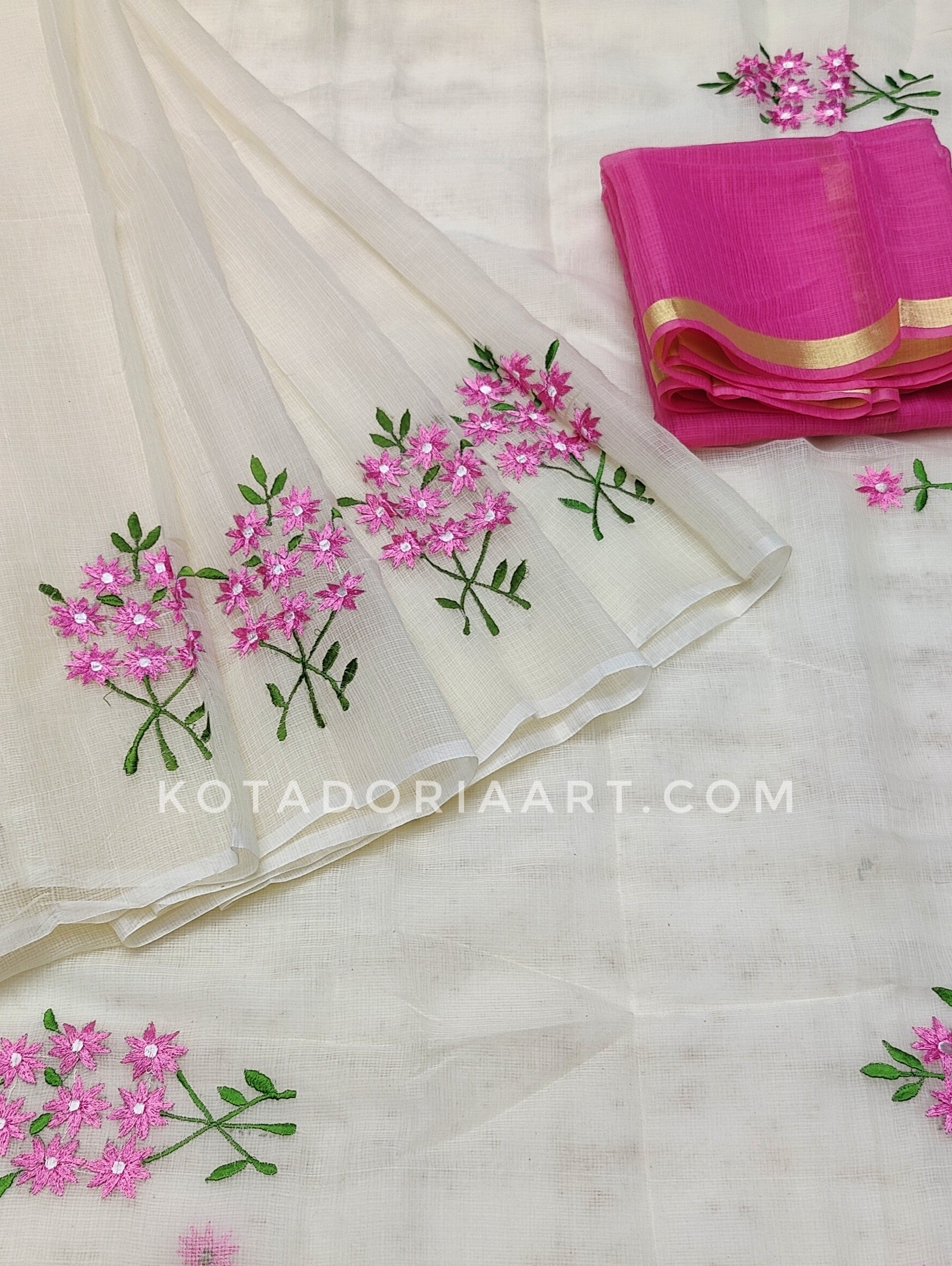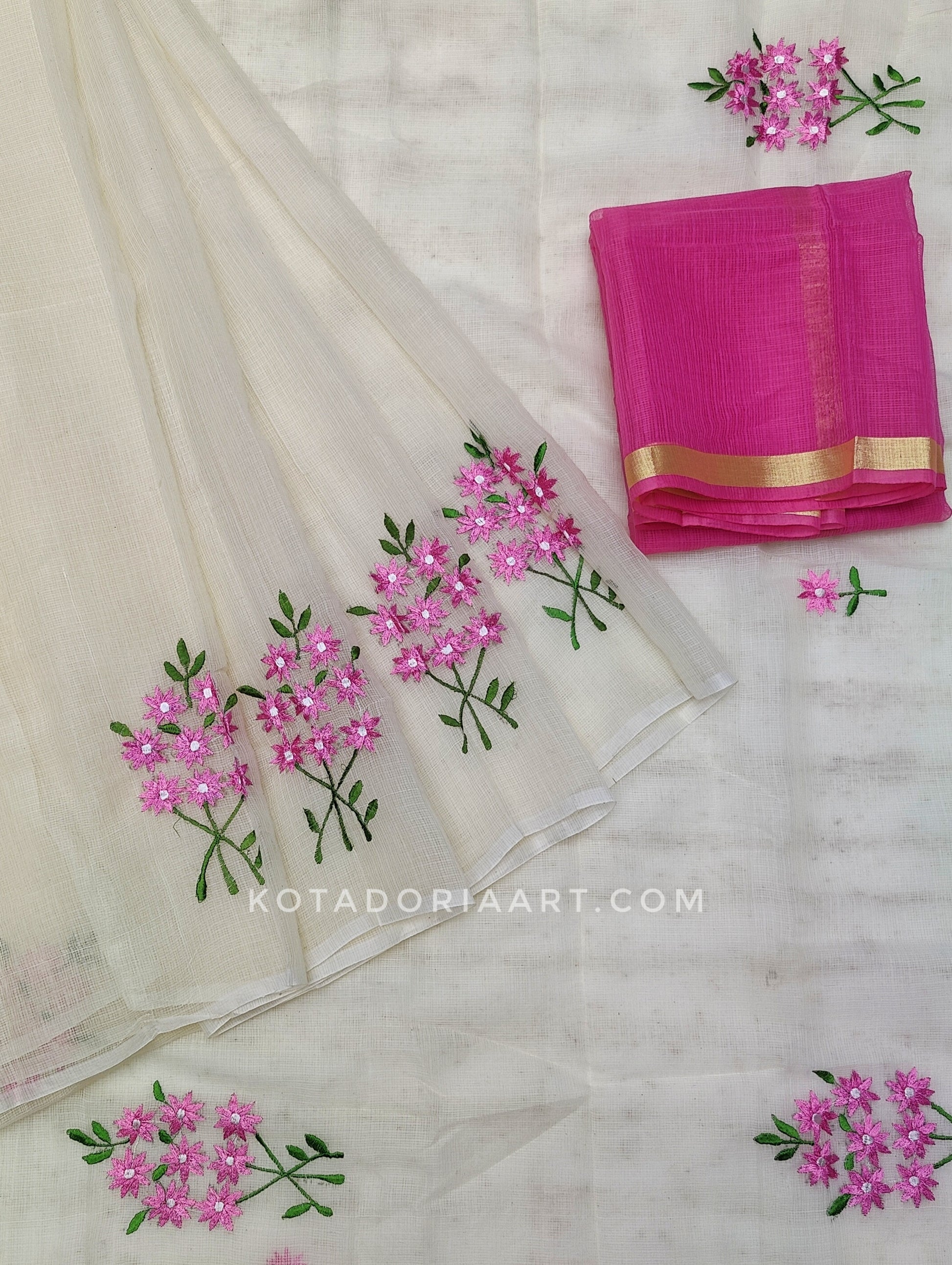 Off White Cotton Kota Doria Embroidery Work Saree With Contrast Blouse Piece