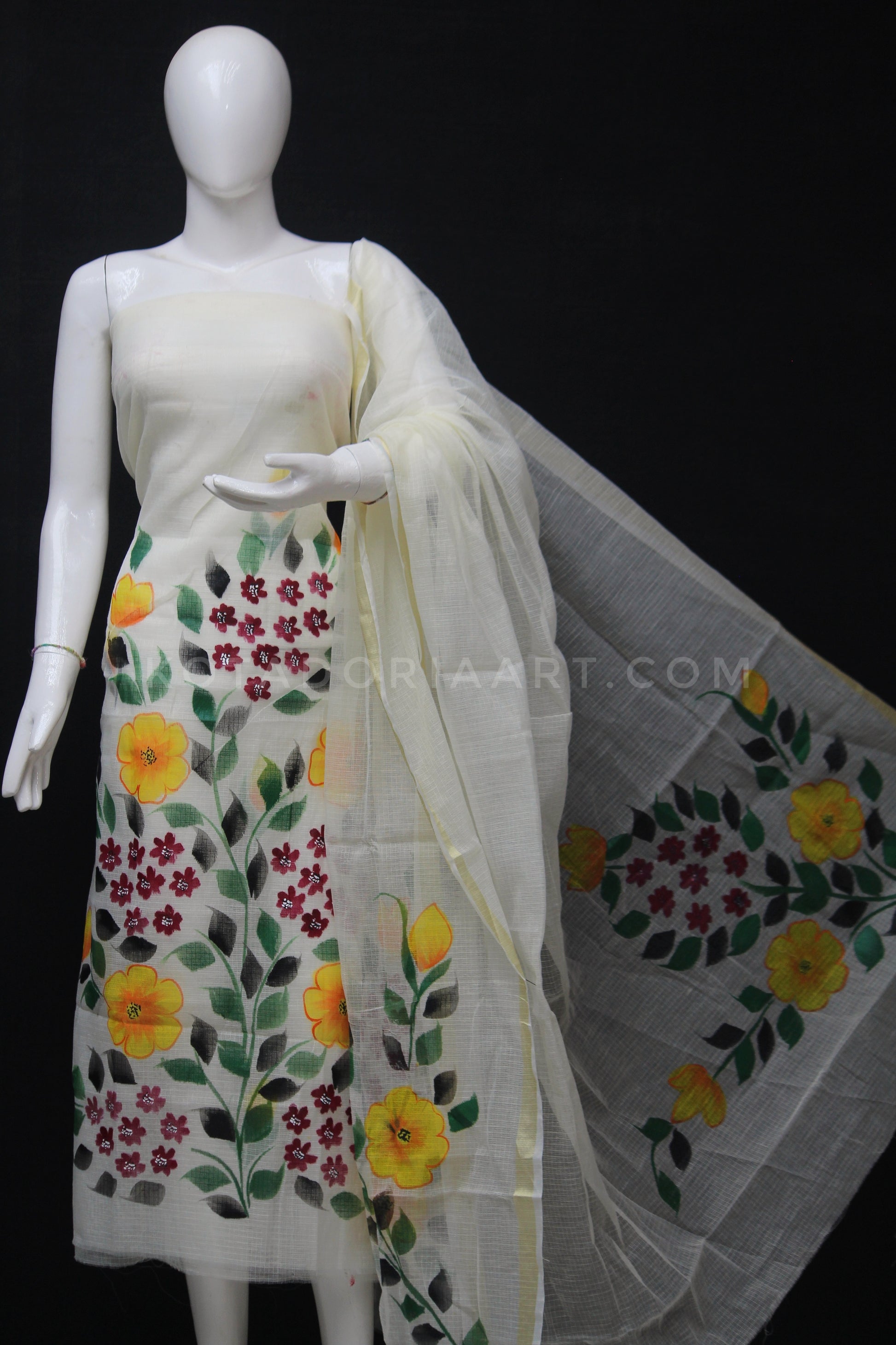 Off White Doria Cotton Hand Pented Dress Material With Bottom.