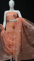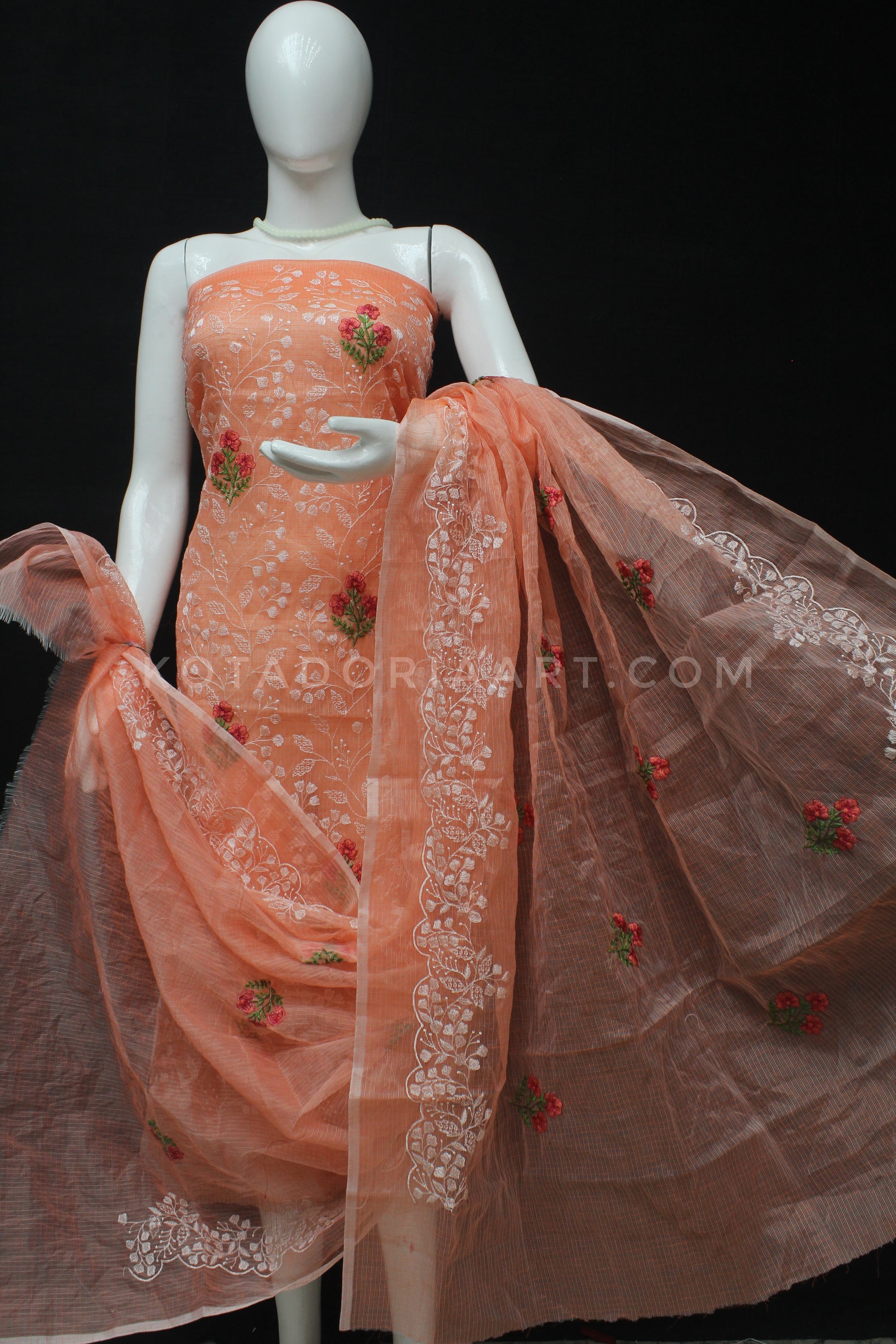 Orange Kota Doria Cotton Embroidery Work Dress Material -