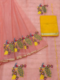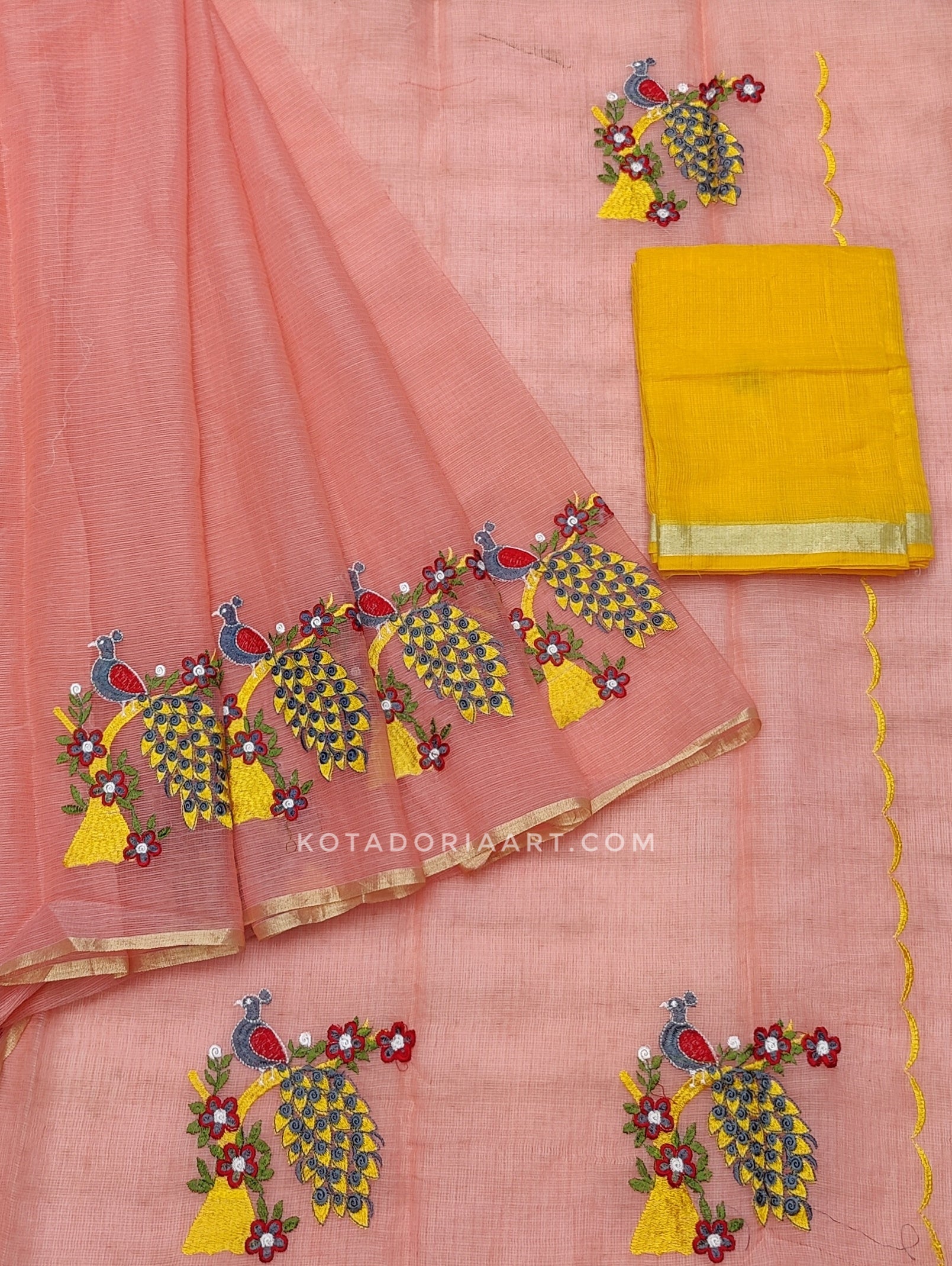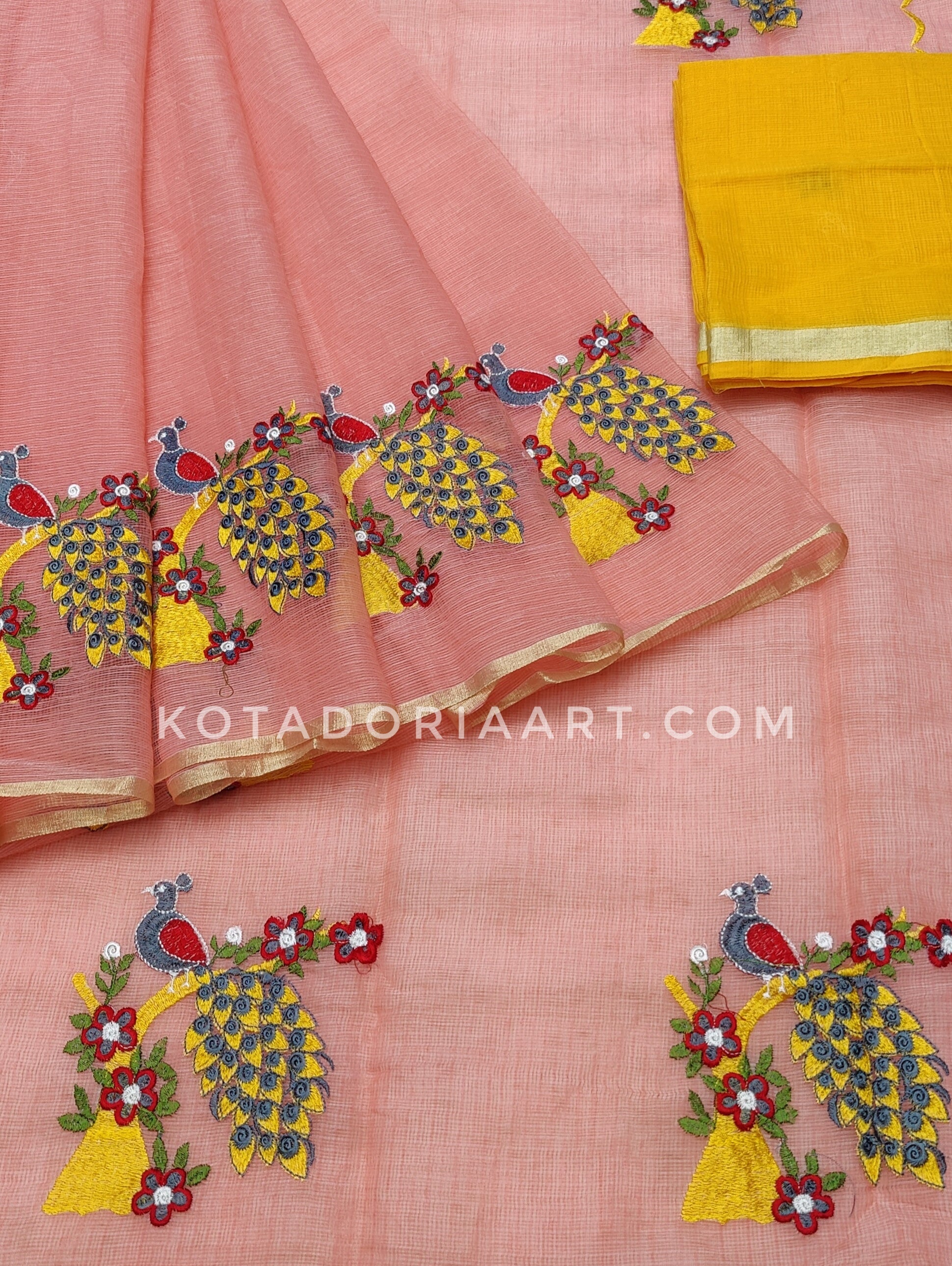 Peach Cotton Kota Doria Embroidery Work Saree With Contrast Blouse Piece