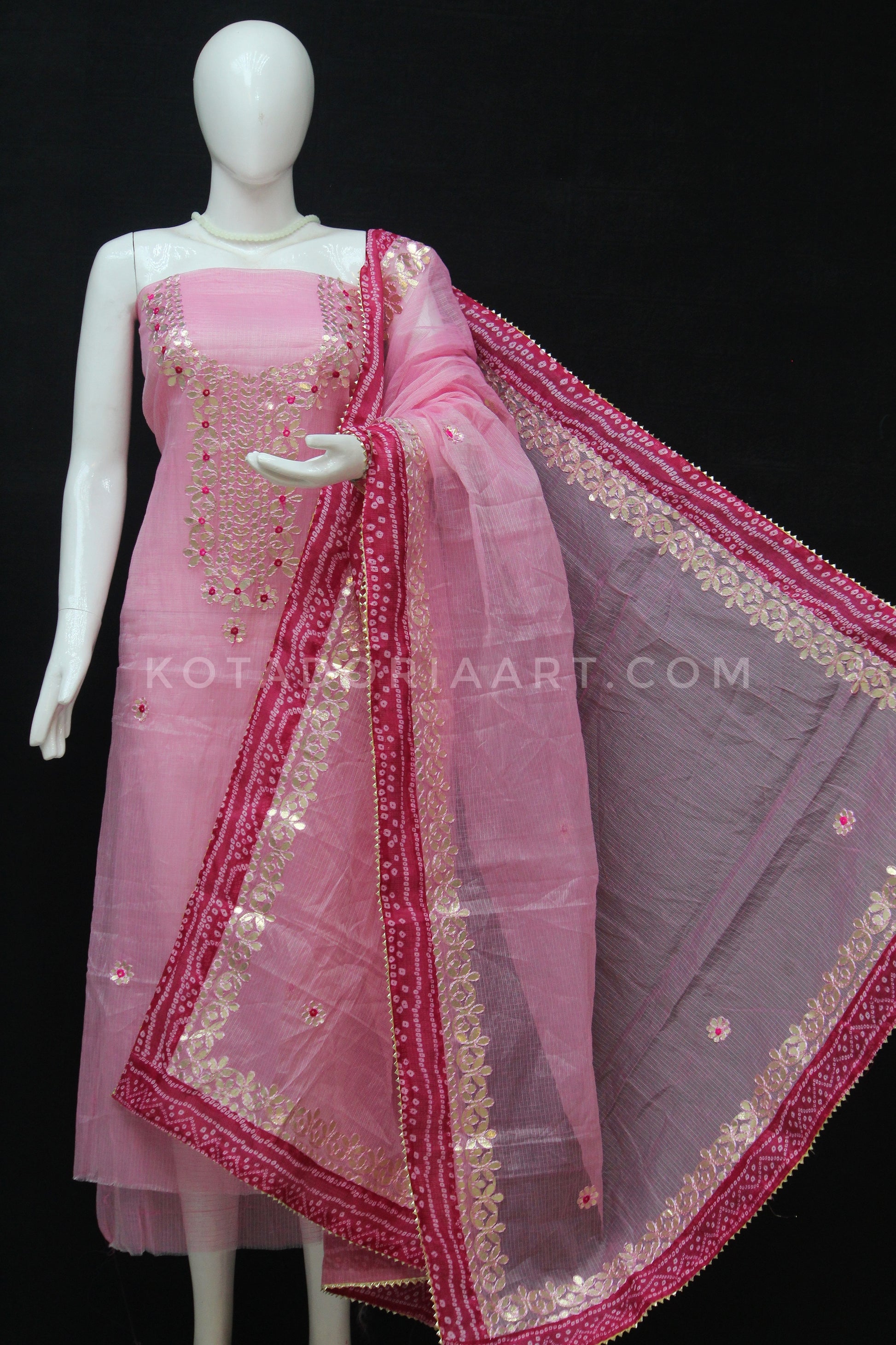 Pink Bandhej Border Kota Doria Cotton Gota-Patti Work Dress Material