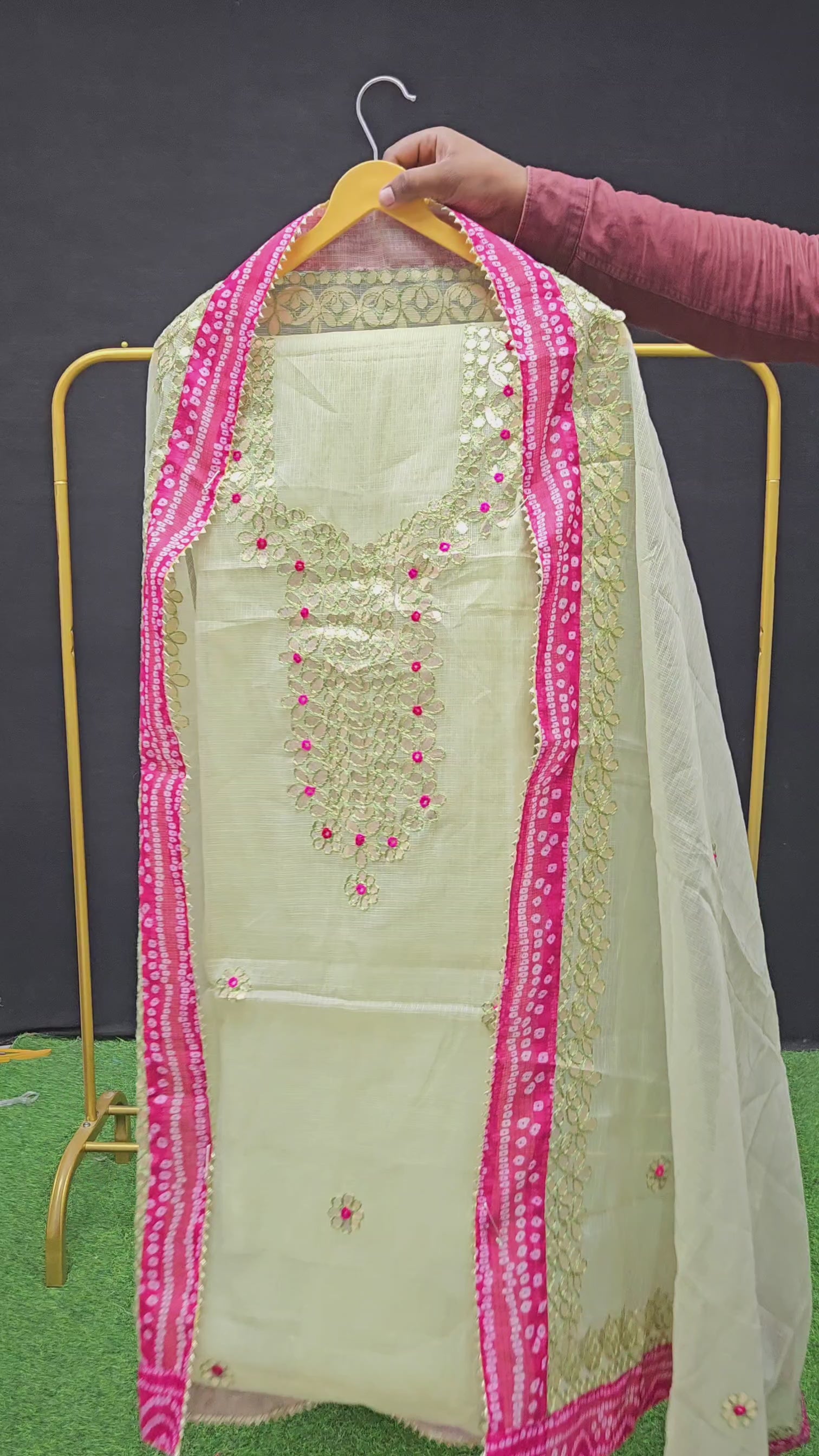 Pista-Green Bandhej Border Kota Doria Cotton Gota-Patti Work Dress Material