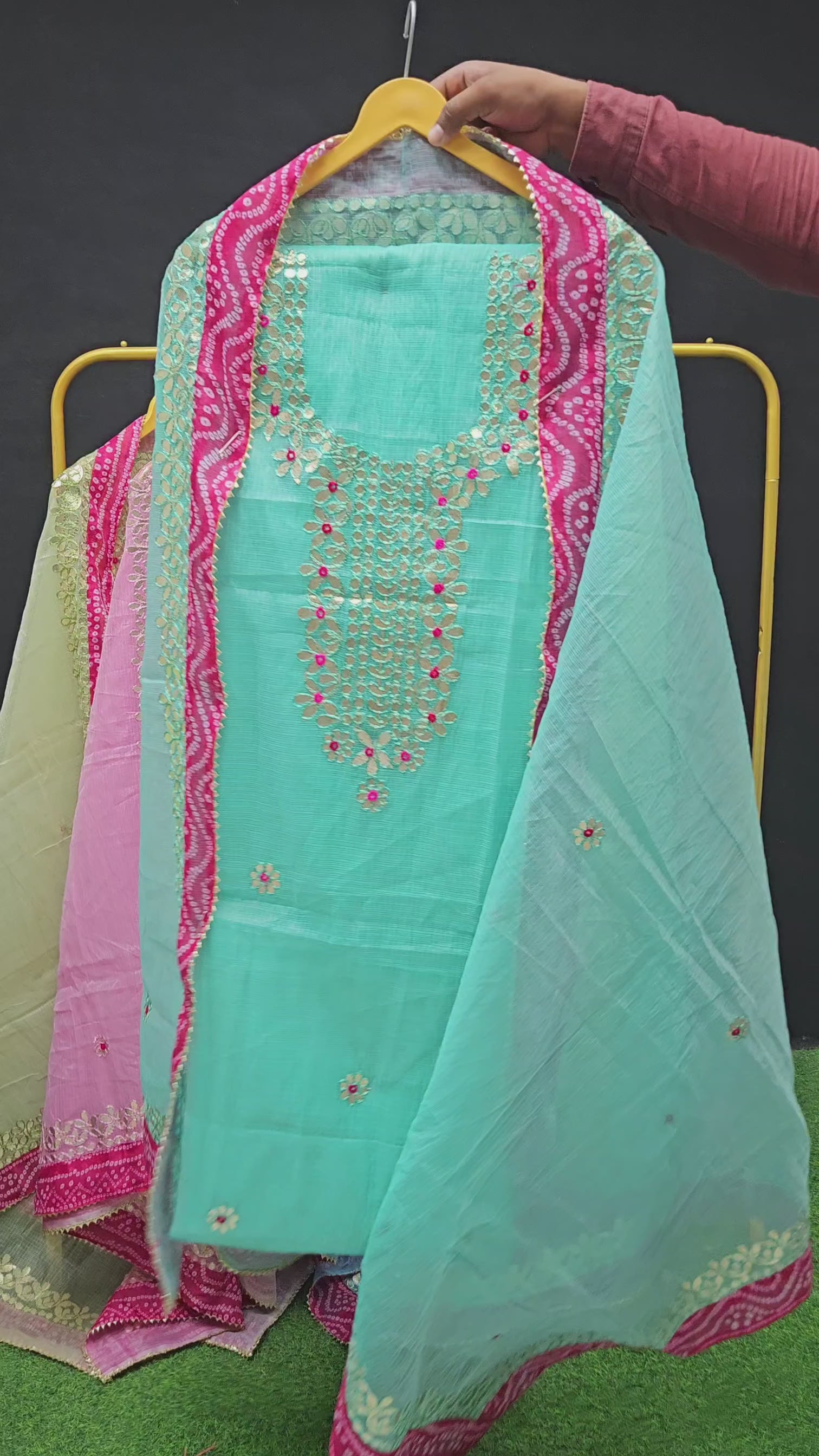 Sea-Green Bandhej Border Kota Doria Cotton Gota-Patti Work Dress Material