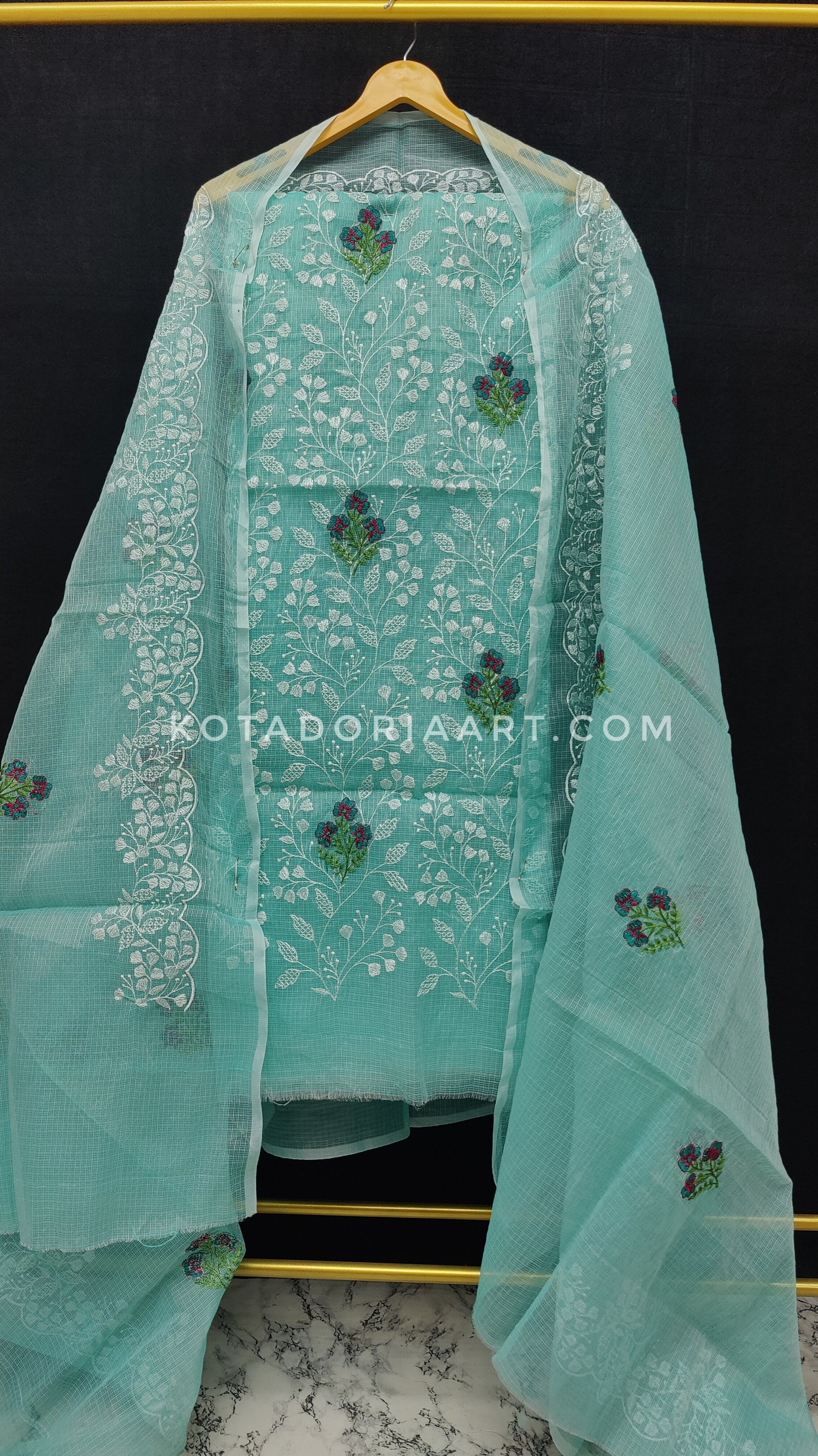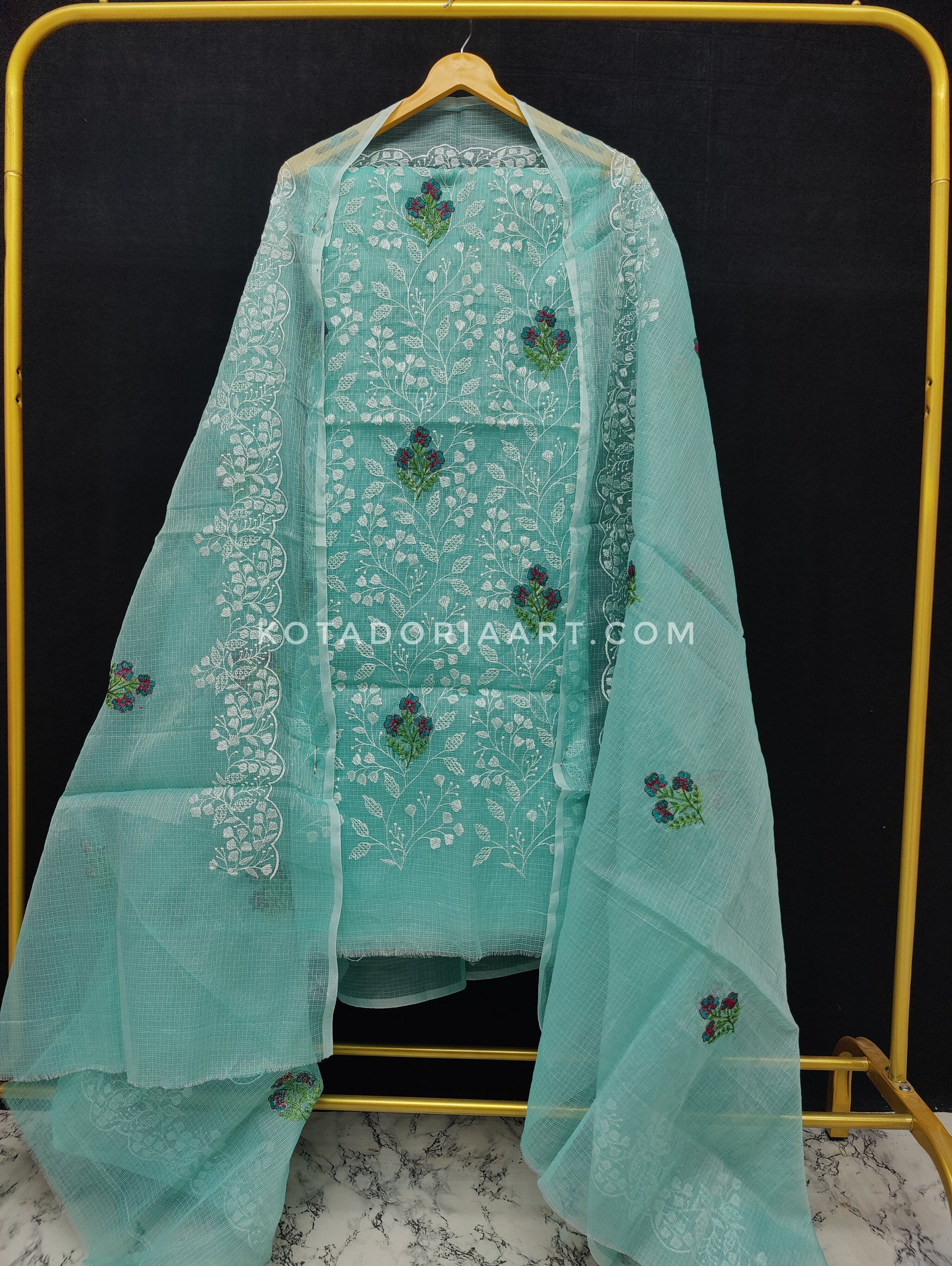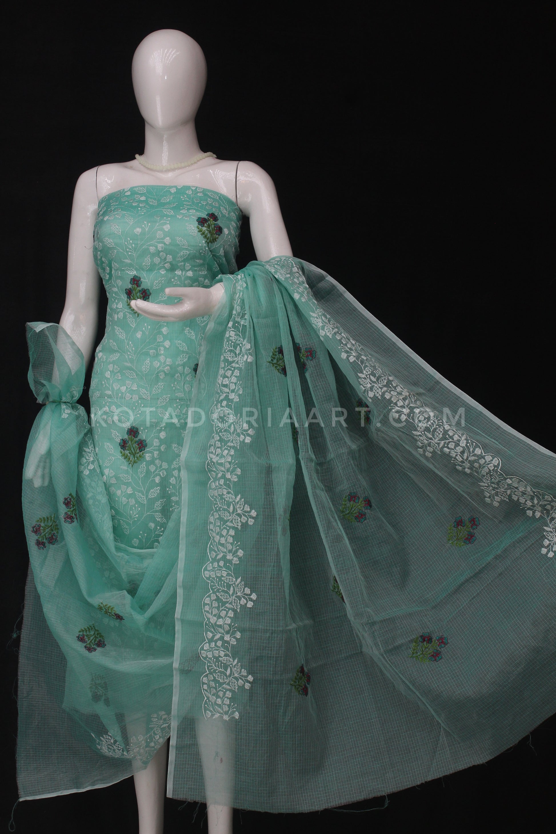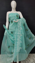 Sea-green Kota Doria Cotton Embroidery Work Dress Material