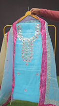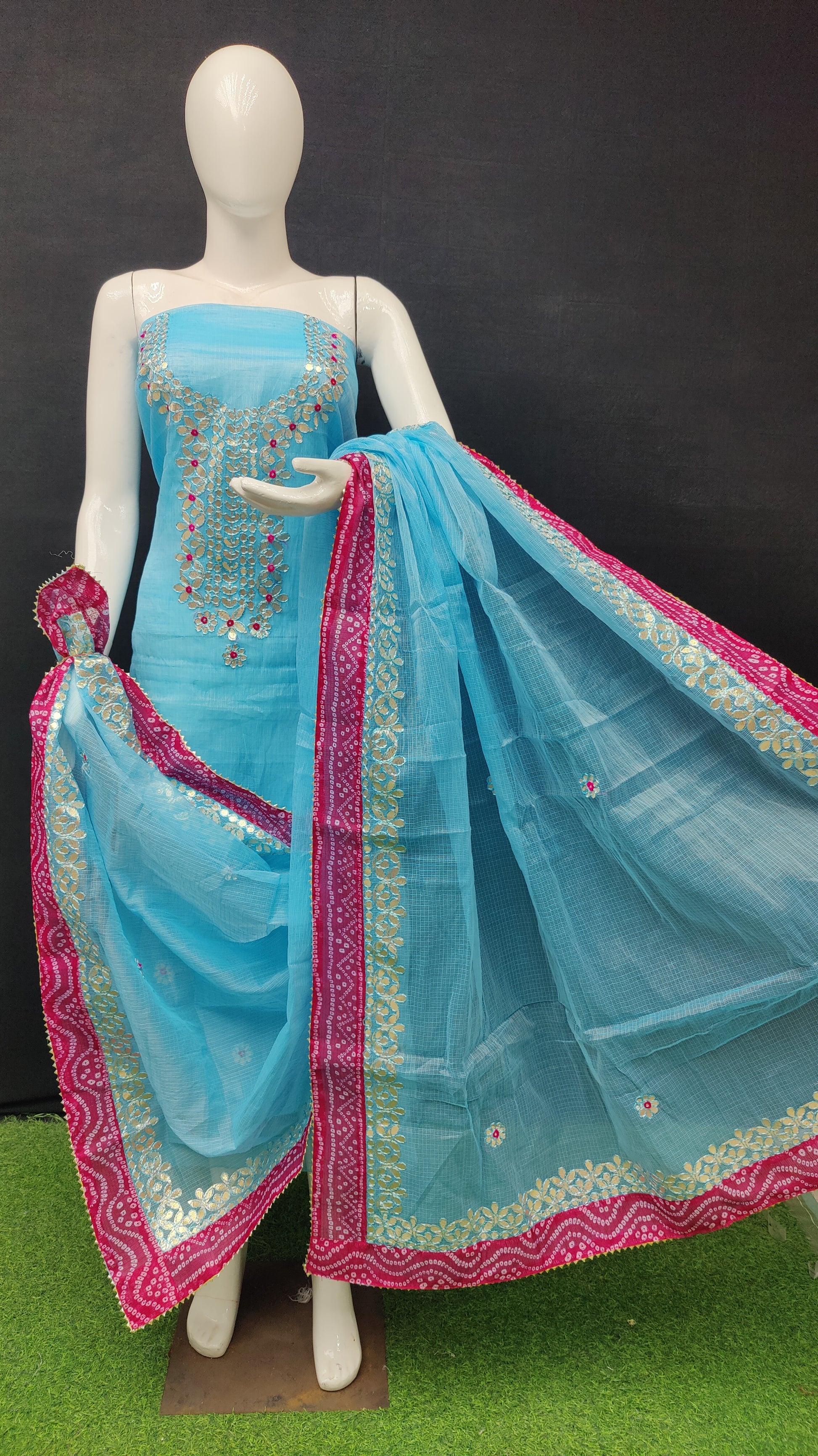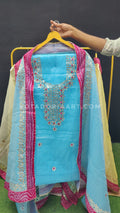 Sky-blue Bandhej Border Kota Doria Cotton Gota-Patti Work Dress Material