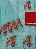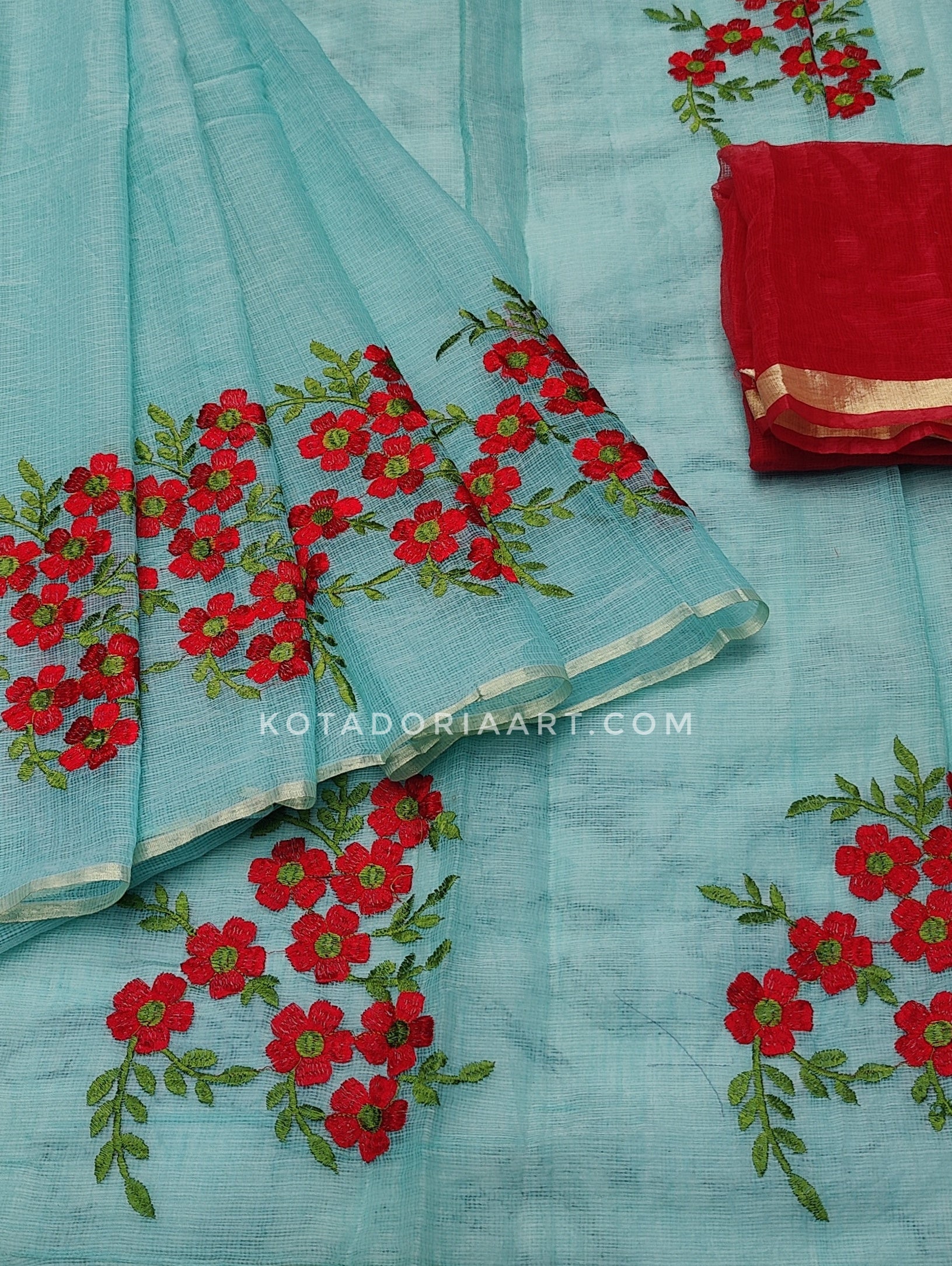 Sea-green Cotton Kota Doria Embroidery Work Saree With Contrast Blouse Piece