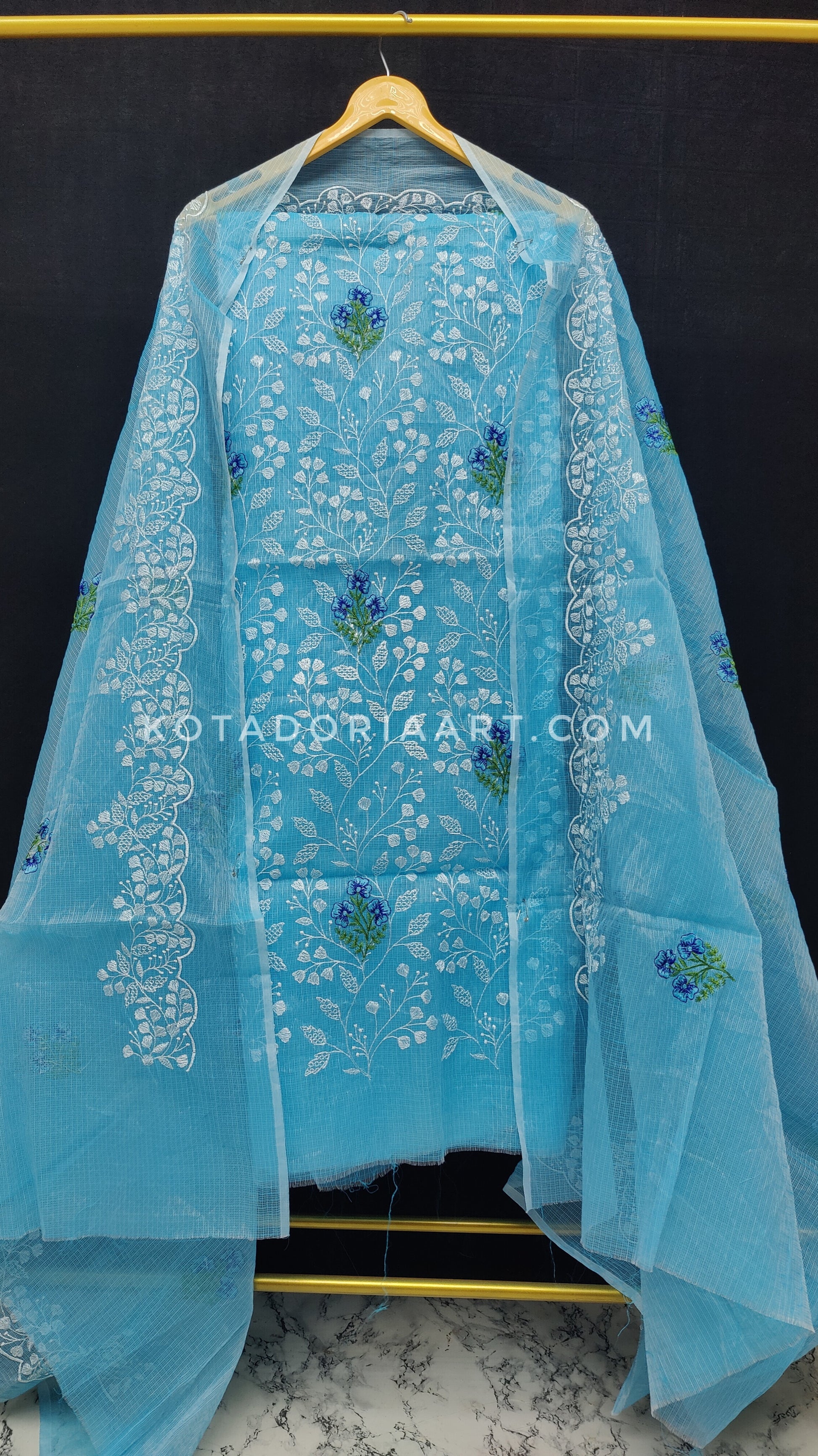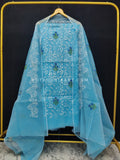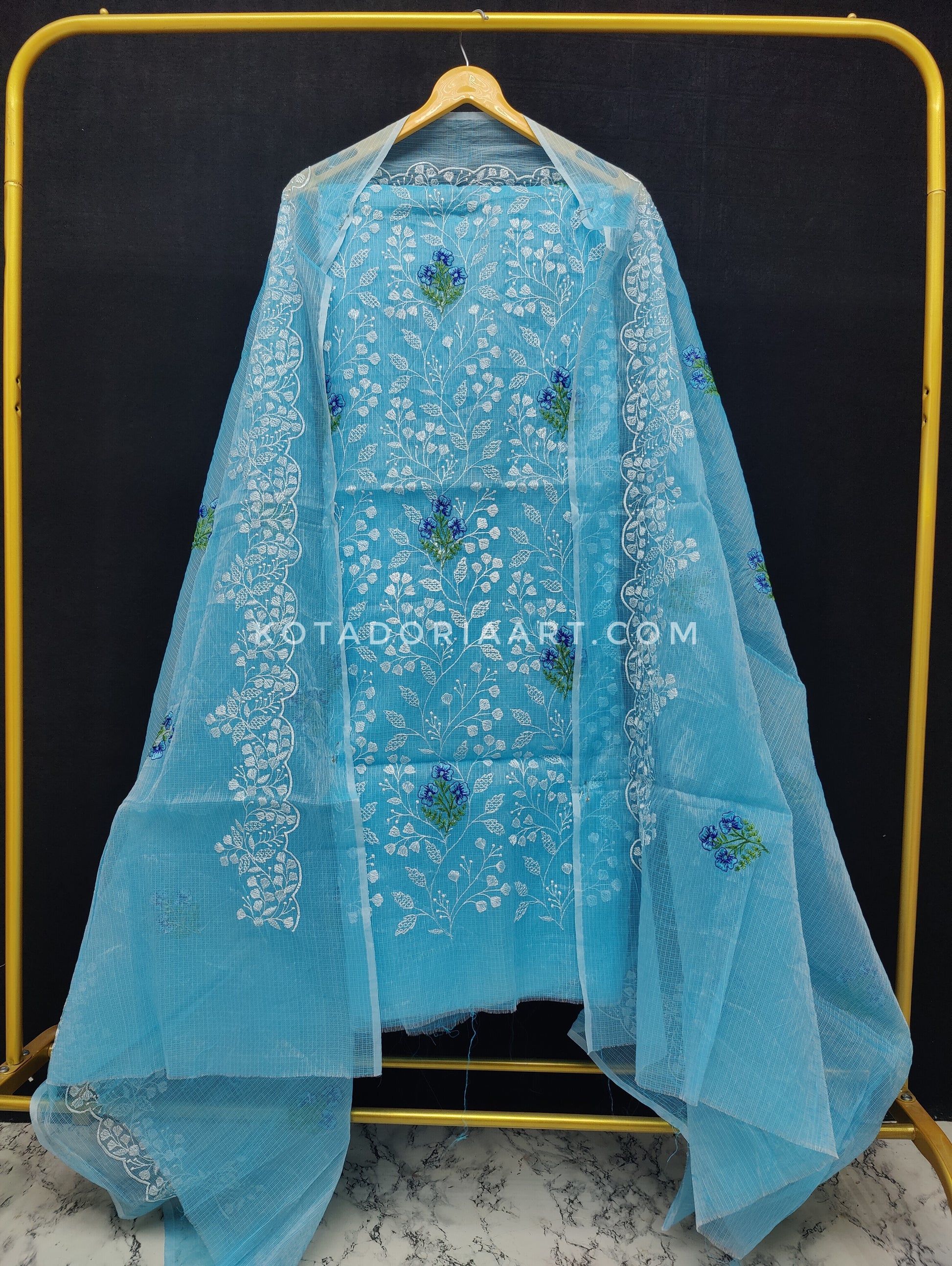 Sky-blue Kota Doria Cotton Embroidery Work Dress Material