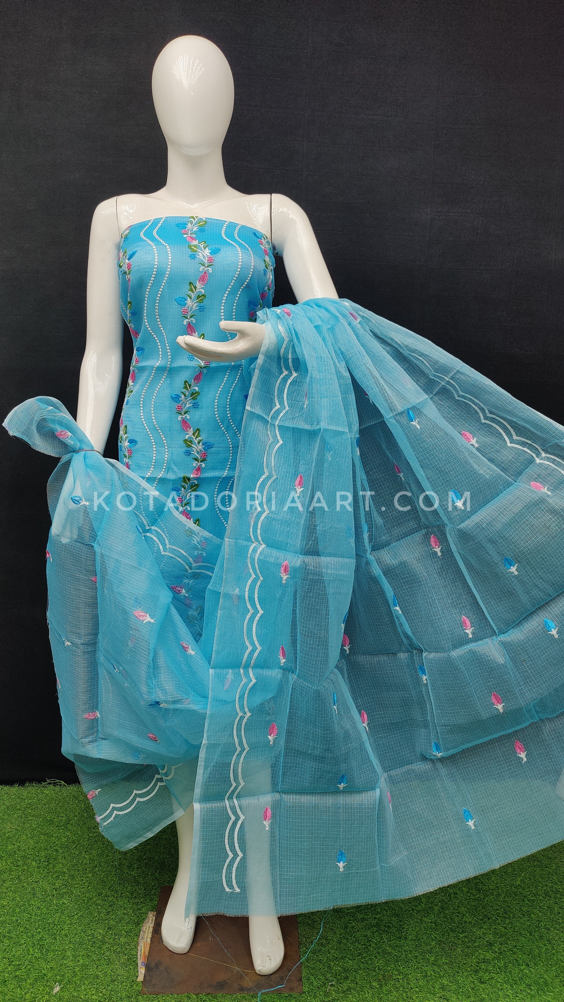Sky-blue Kota Doria Cotton Embroidery Work Dress Material