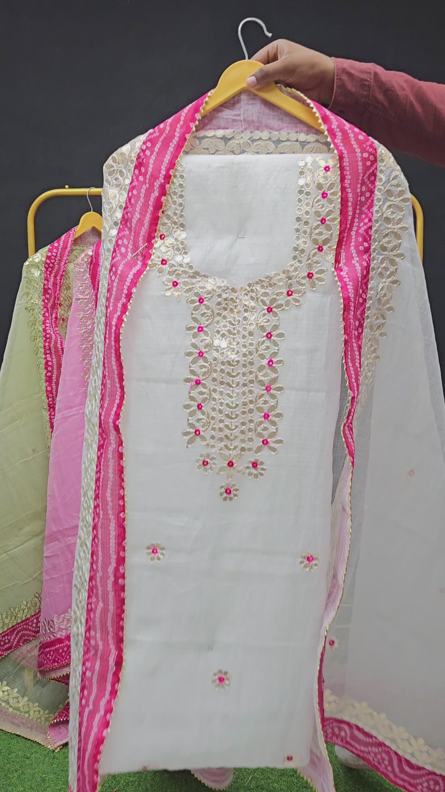 White Bandhej Border Kota Doria Cotton Gota-Patti Work Dress Material