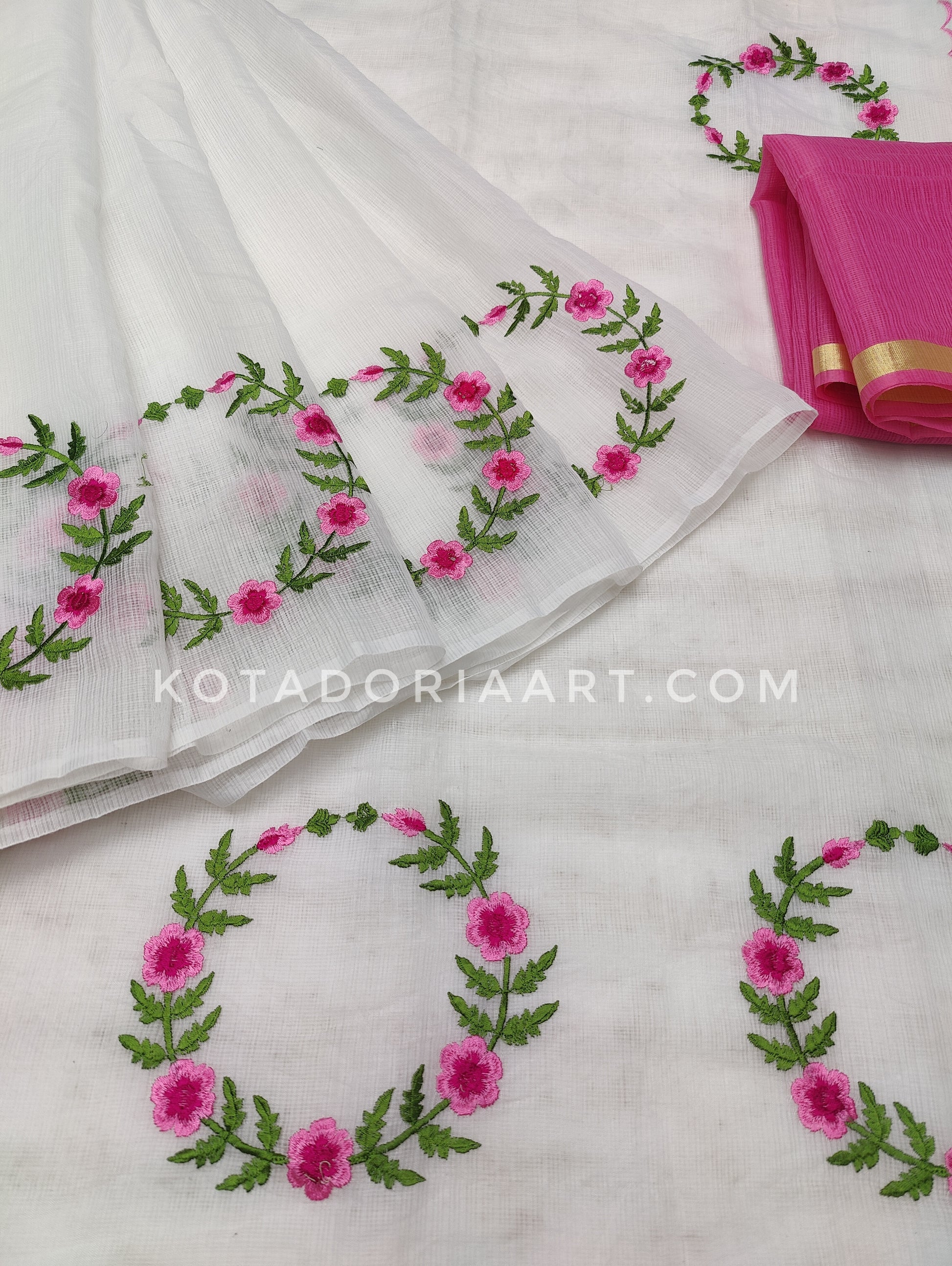 White Cotton Kota Doria Embroidery Work Saree With Contrast Blouse Piece