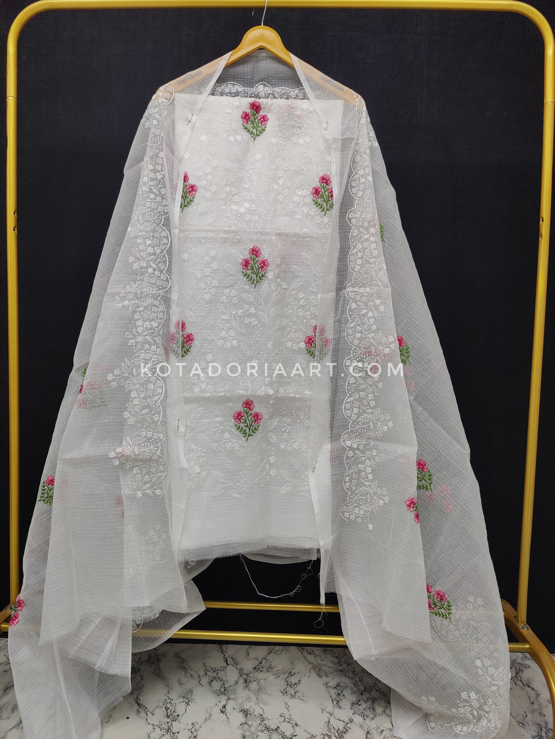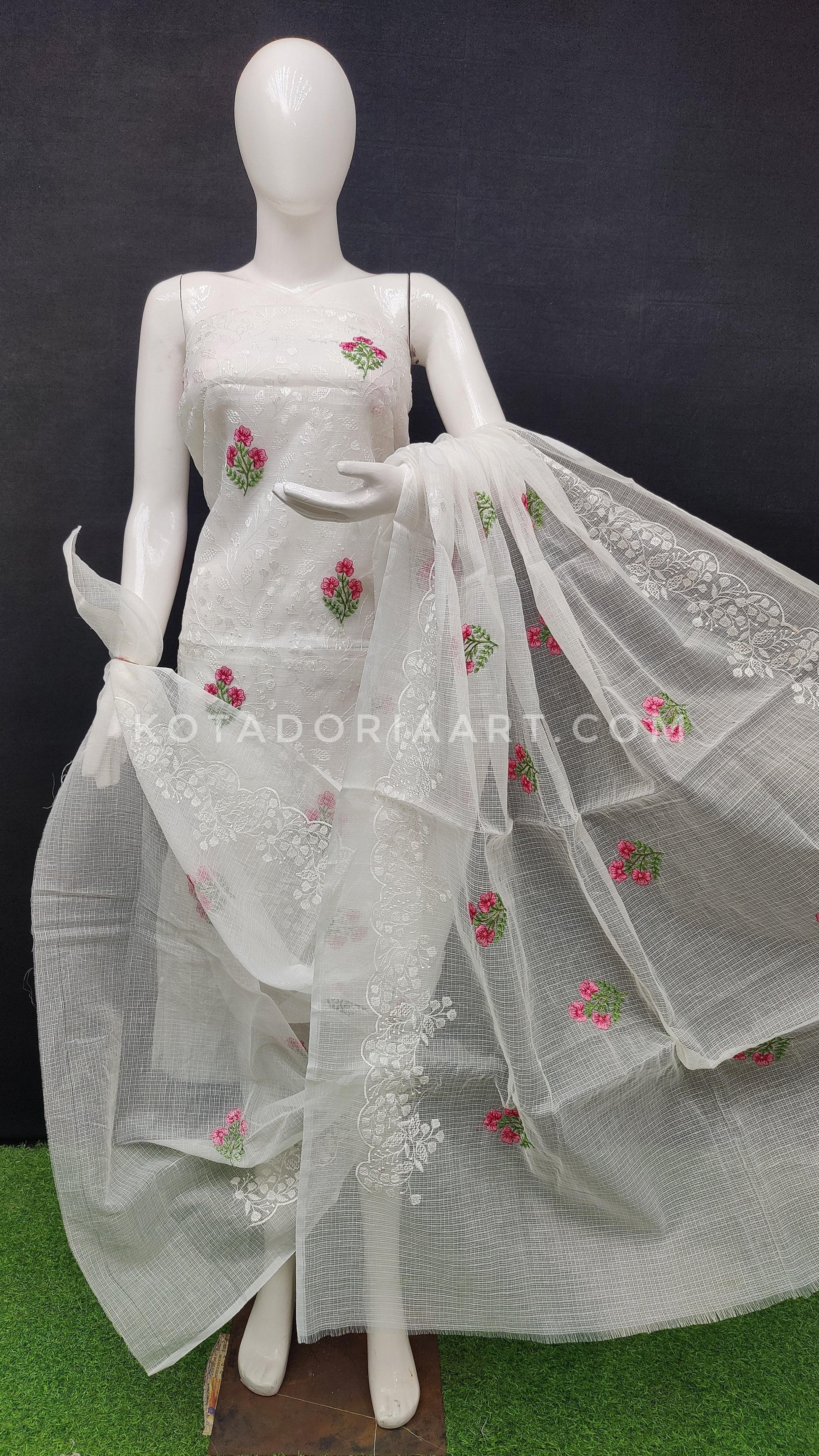 White Kota Doria Cotton Embroidery Work Dress Material